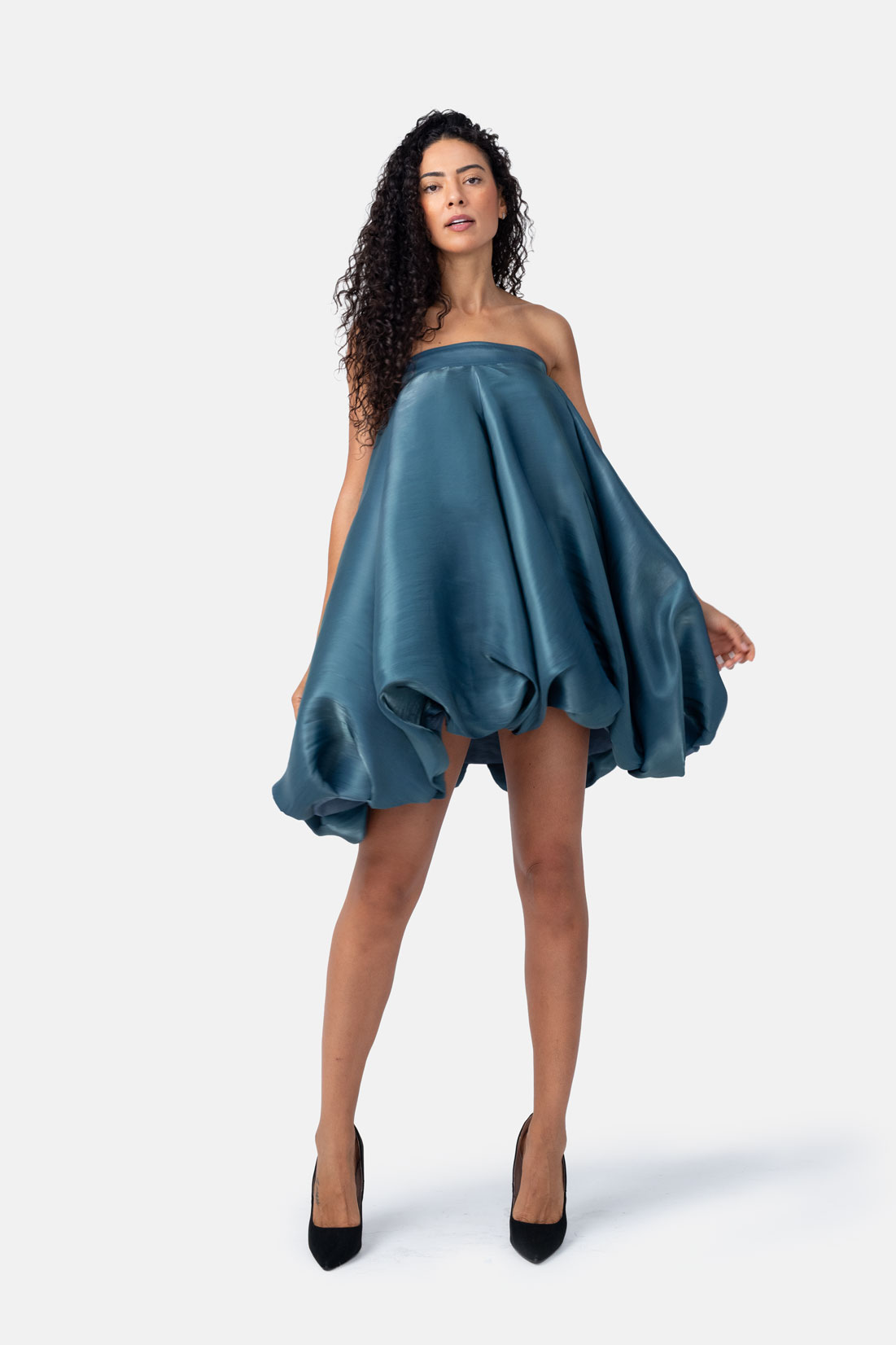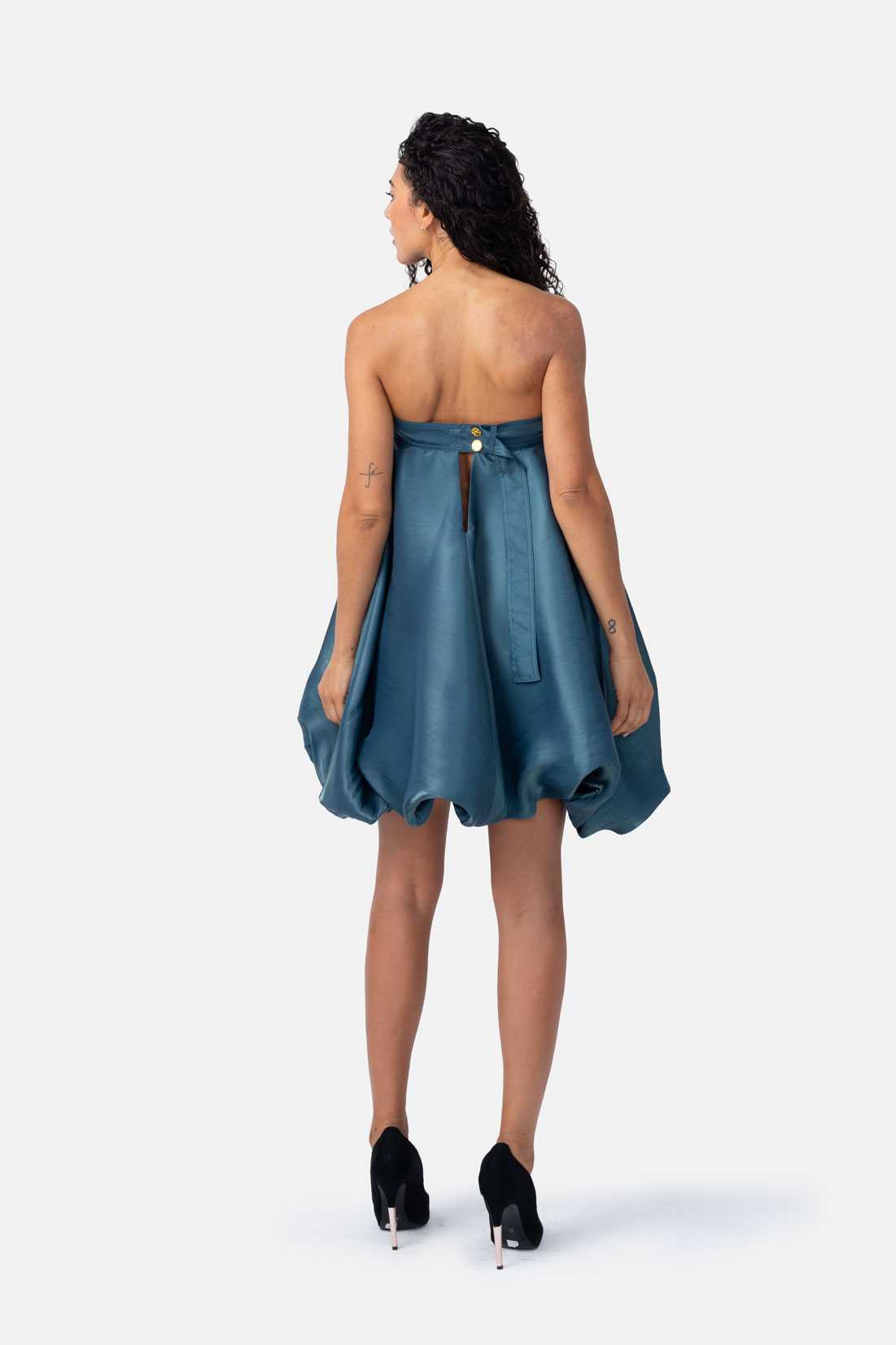 Teal Strapless Bubble Mini Dress – Silky Satin With Dupion Effect