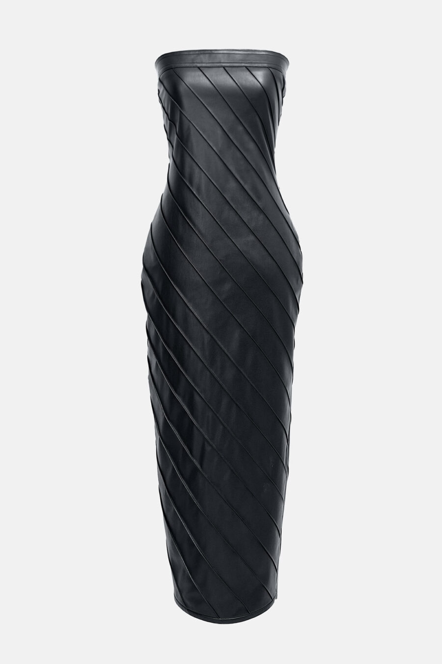 Designer Black Leather Midi Pencil Dress, Strapless With Pleated Finish