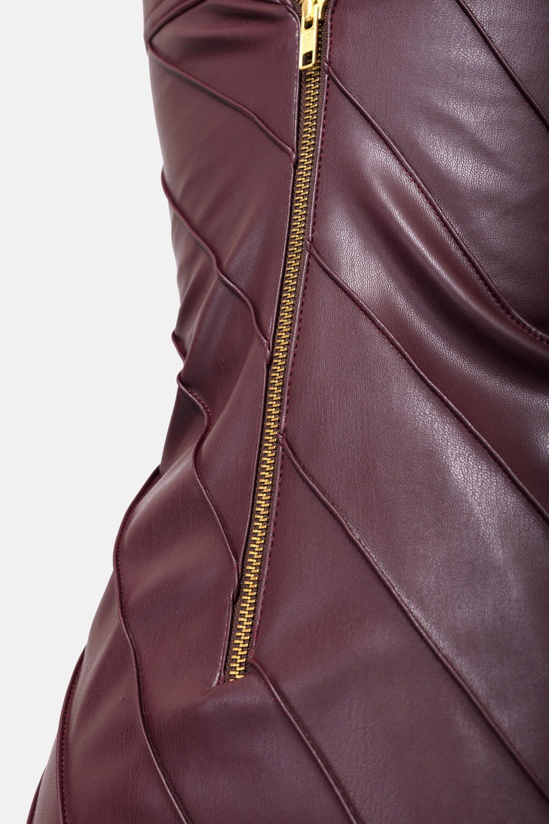 This Burgundy Red Vegan Leather Pencil Dress delivers a clean, sculpted profile through diagonal hand-pleating, a midi length, and a sleeveless cut. A golden back zip, full premium cupro lining, and a subtle hem slit keep it comfortable and easy to wear. With its refined focus on shape, this designer leather dress looks tailored, not tight. Slip it on and fasten at the back. The tactile pleating builds dimension and definition, shaping a feminine line while visually lengthening the body.