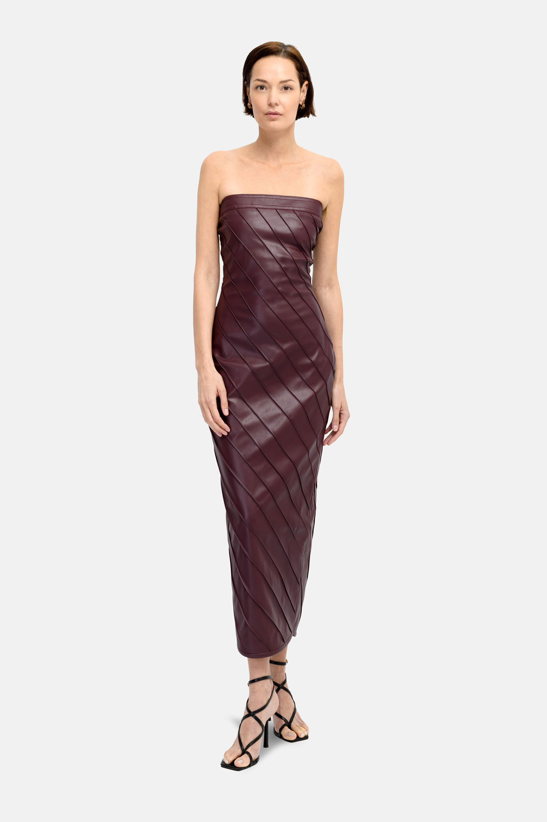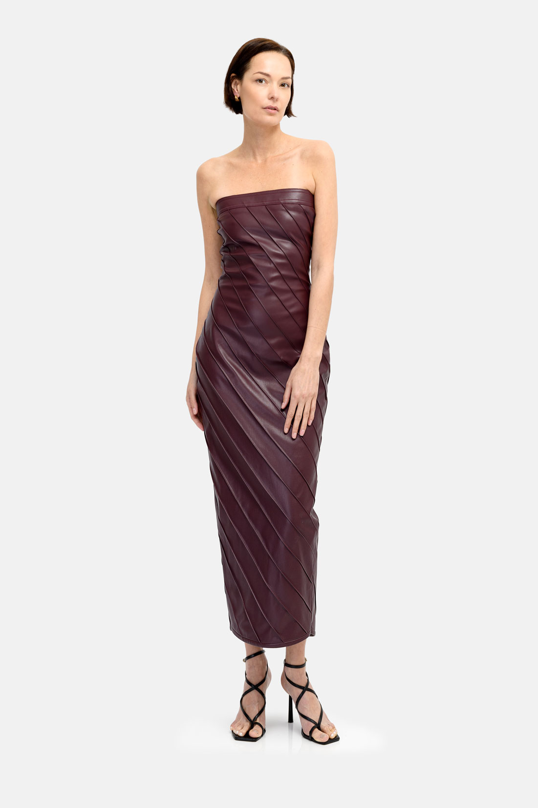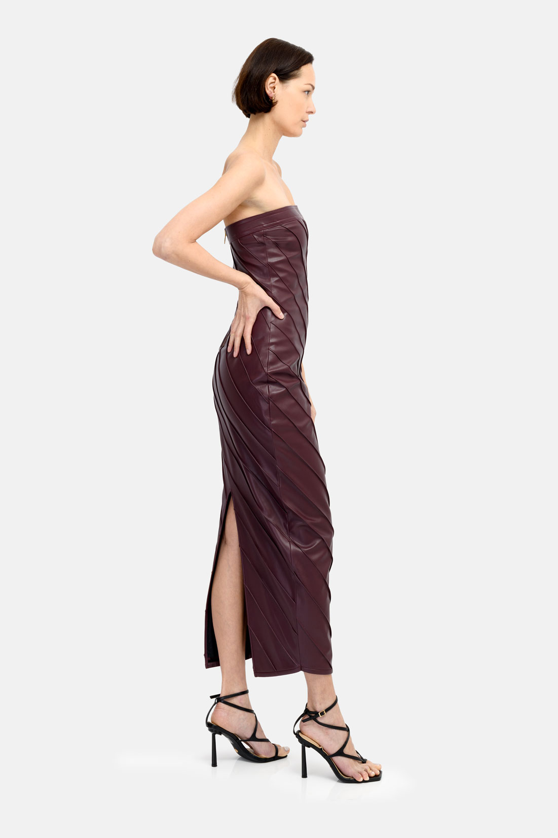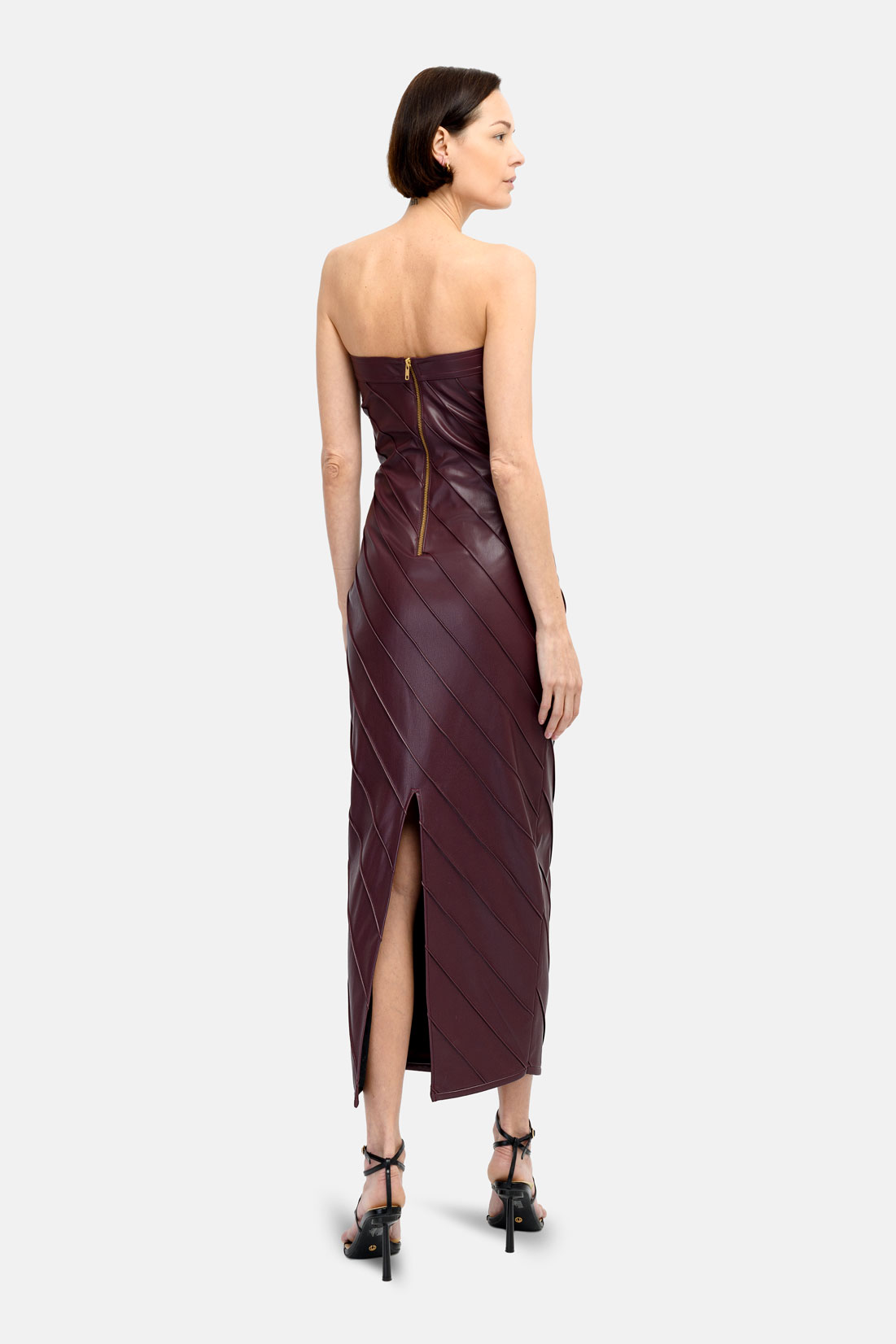 Designer Burgundy Leather Midi Pencil Dress, Strapless With Pleated Finish