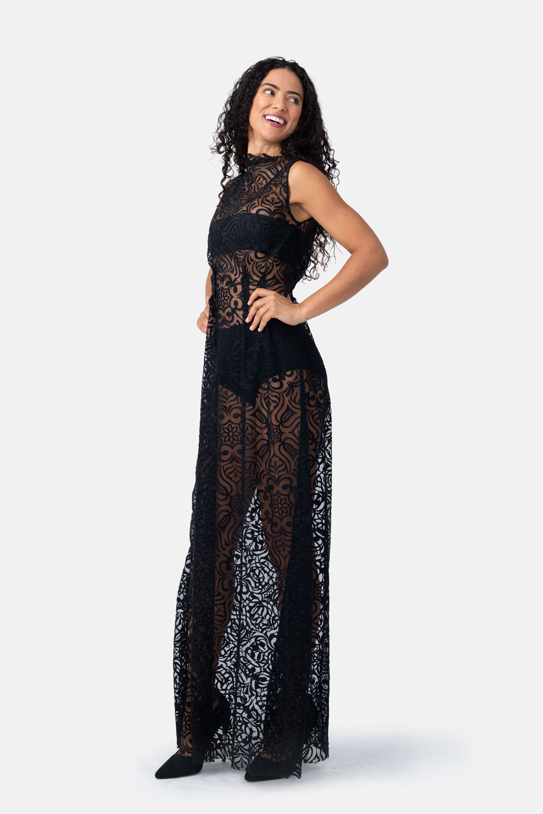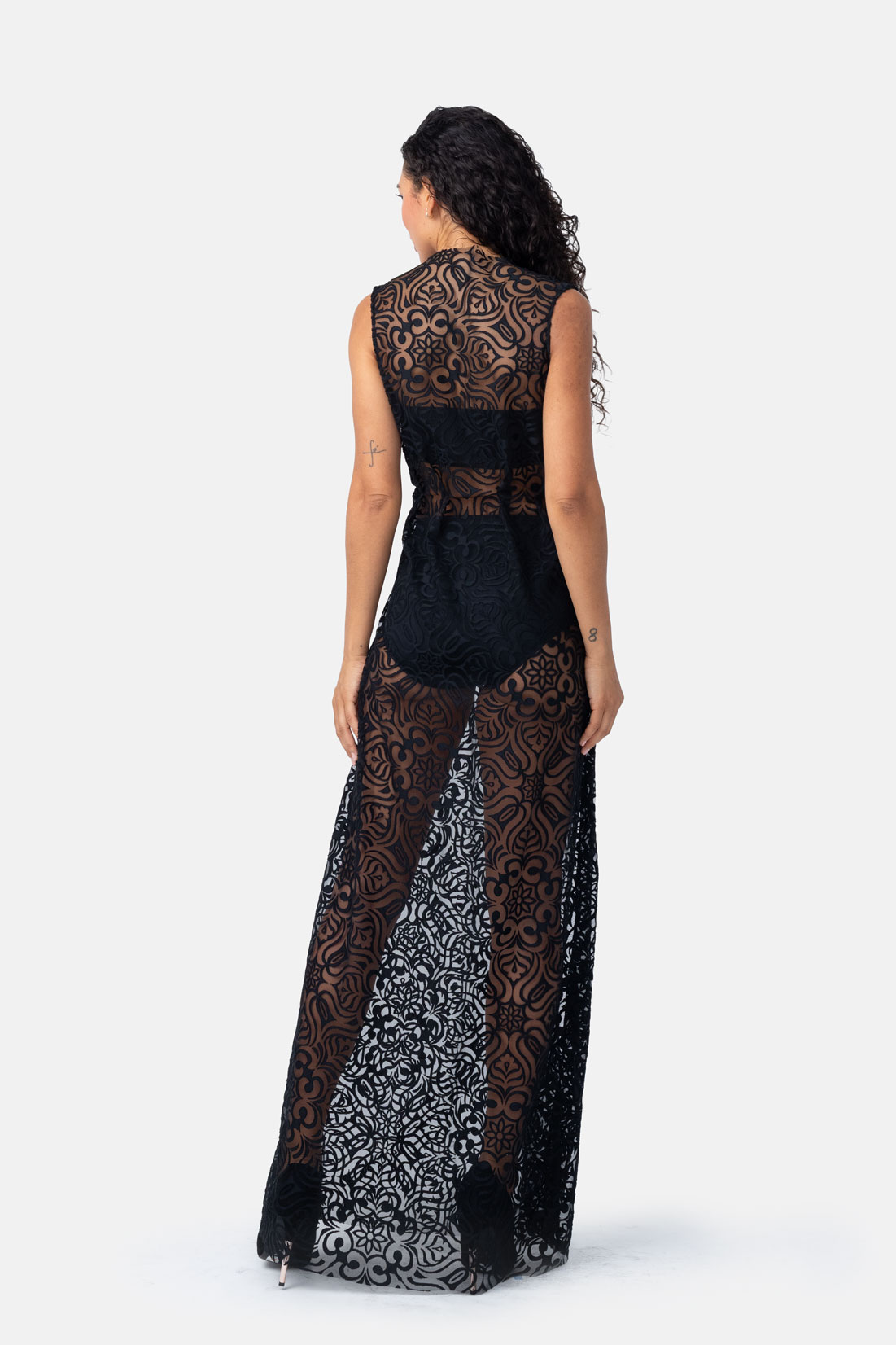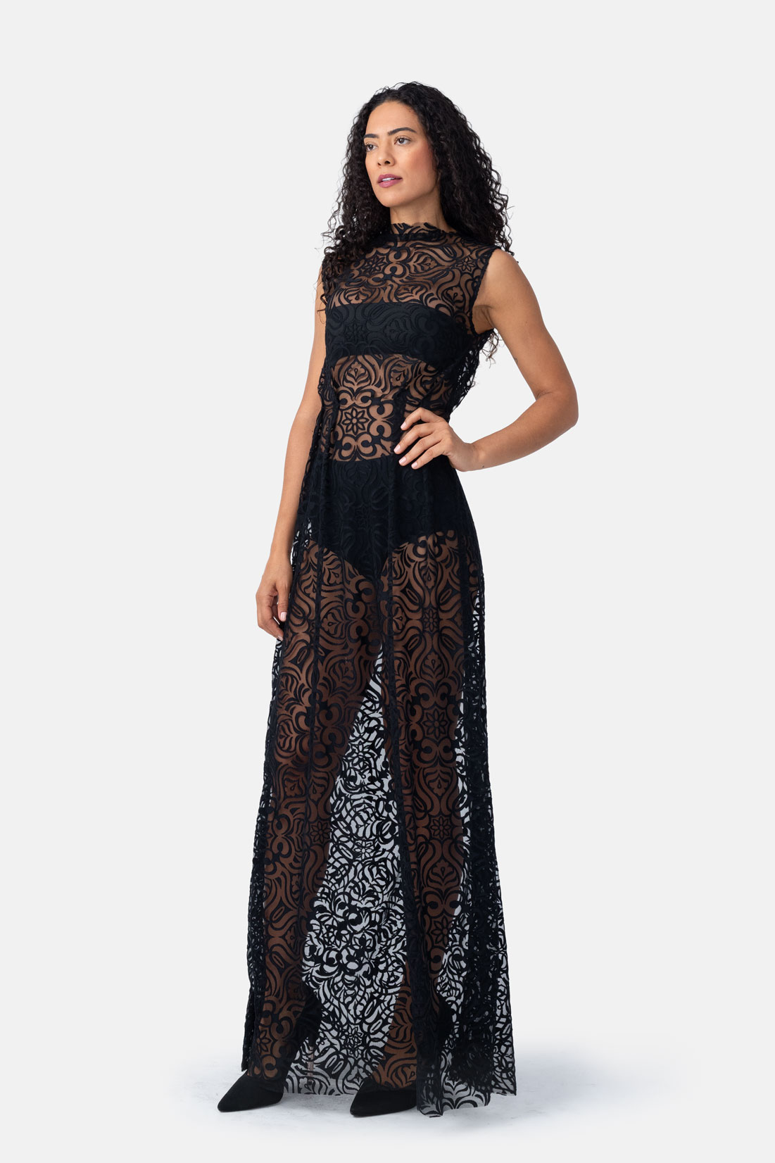 Crafted from an intricate, high-stretch mesh lace, this halter maxi dress artfully combines floor-length drama with ethereal transparency. The silhouette is defined by meticulous pleated detailing from the waist to the hemline, creating a fluid, architectural movement that enhances the garment’s organic floral motifs. Designed for a seamless slip-on fit, this sheer statement piece offers infinite layering potential for sophisticated evening wardrobes. Its diaphanous texture and structured drape make it a definitive choice for avant-garde occasion wear.