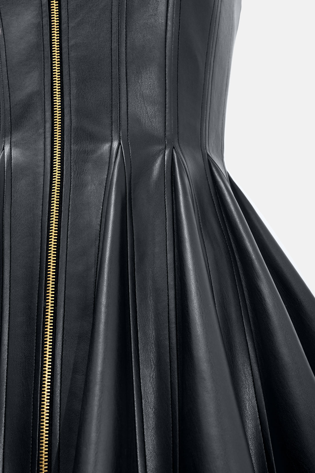 Pleated Black Leather Mini Dress – Evening Zip Up With High Neck & Designer Faux