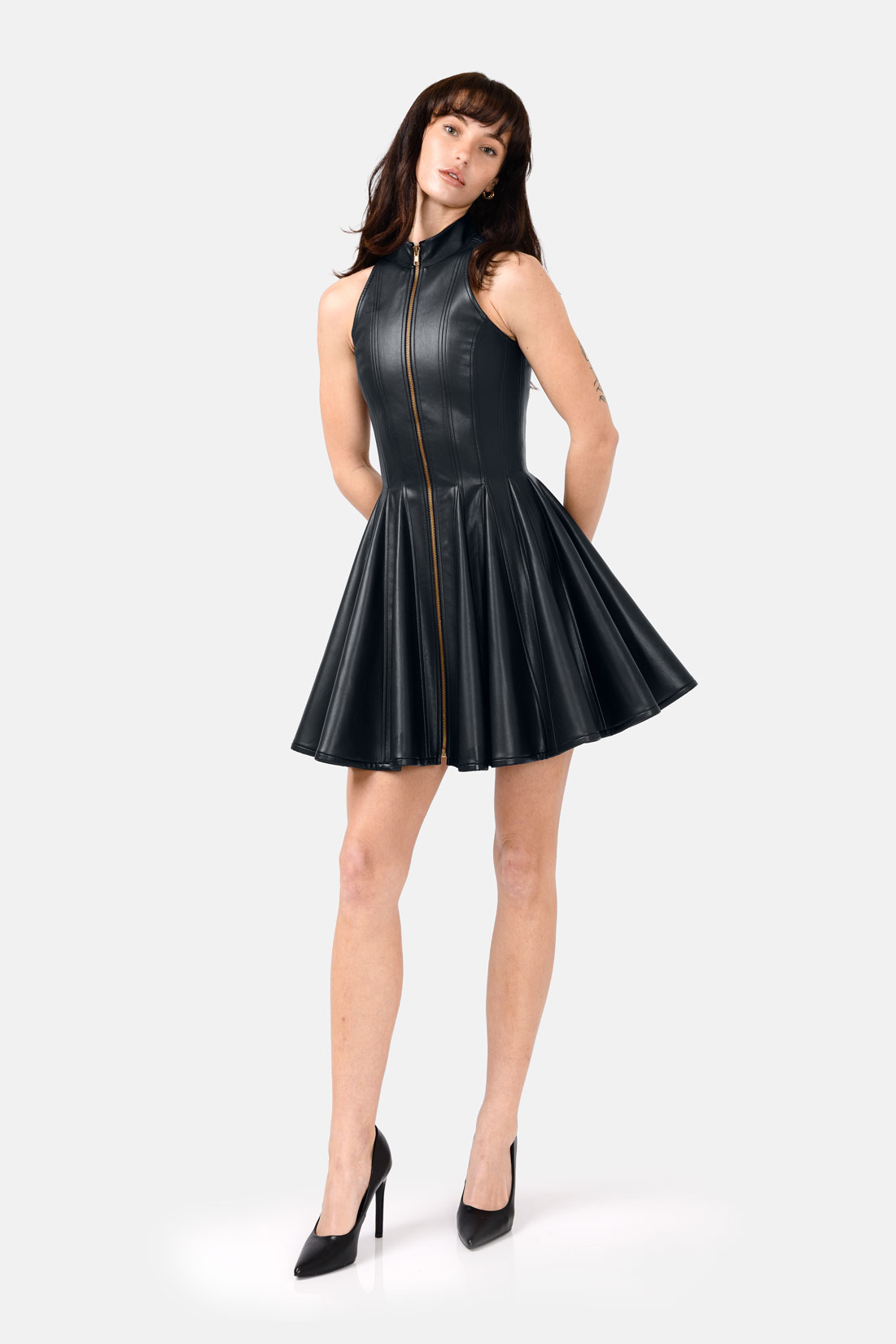 The pleated hem adds bold volume and sharp visual contrast to the fitted bodice. It introduces movement and shape to the structured design, giving the black vegan leather mini dress a dramatic finish with just the right amount of edge.