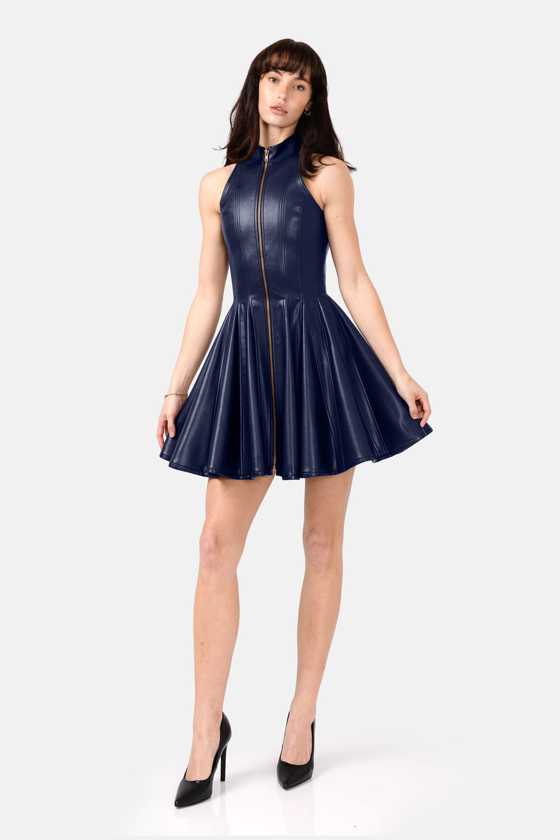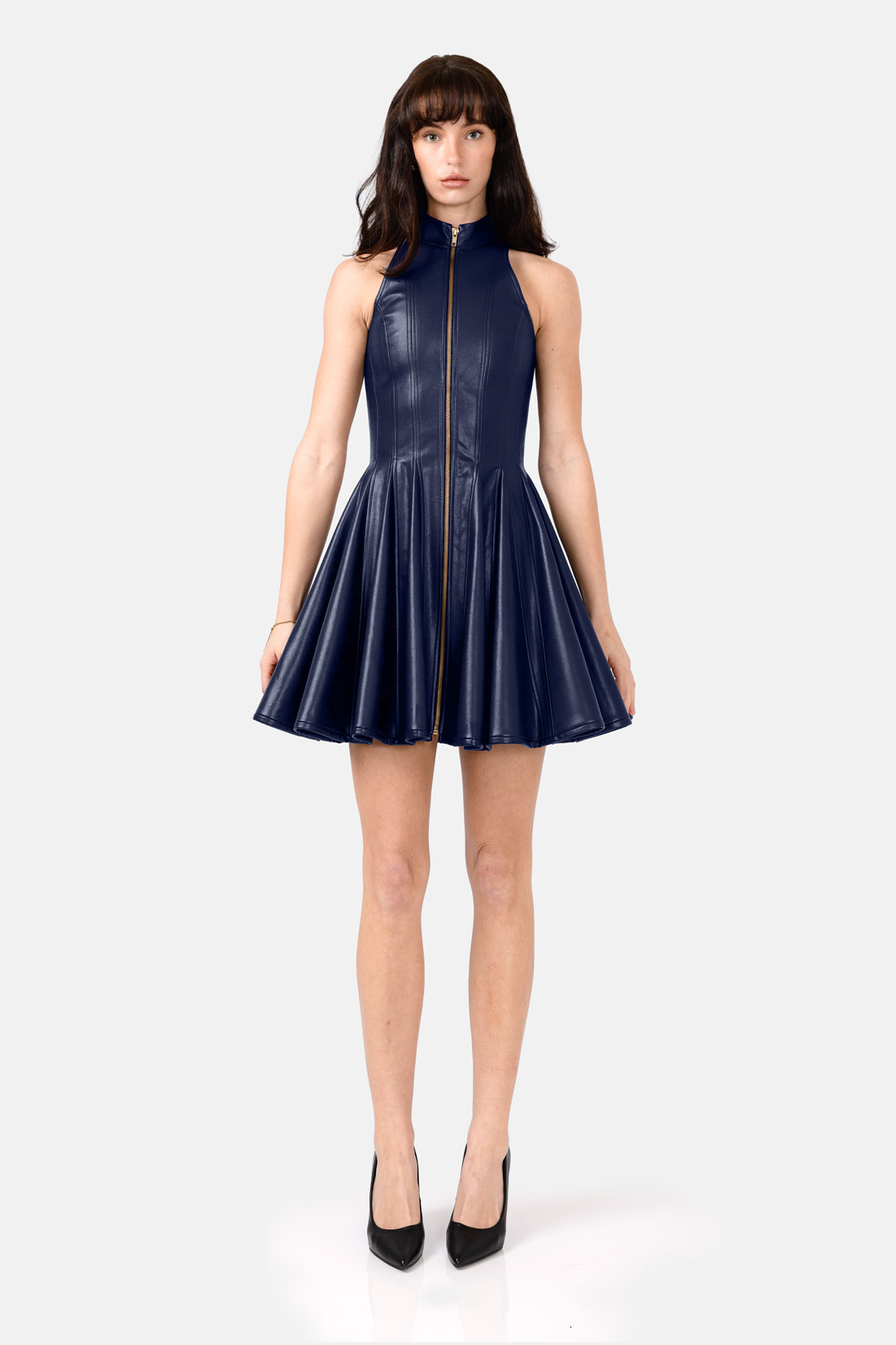 The dress is built from precision-cut faux leather panels that sculpt the body through the waist, then kick out into a bold pleated hem. The zip-up design and structured construction give this navy blue leather mini dress a clean, architectural shape that flatters and holds.
