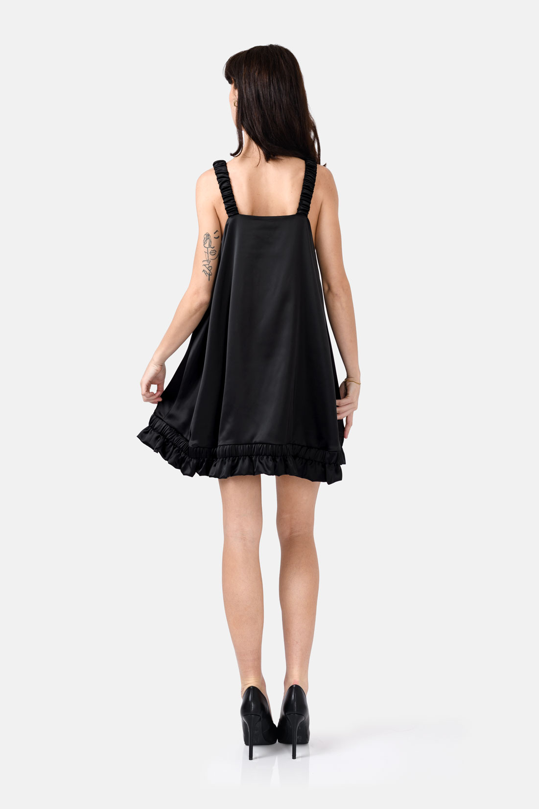 Silky Black Satin Slip Mini Dress with Ruffled Hem