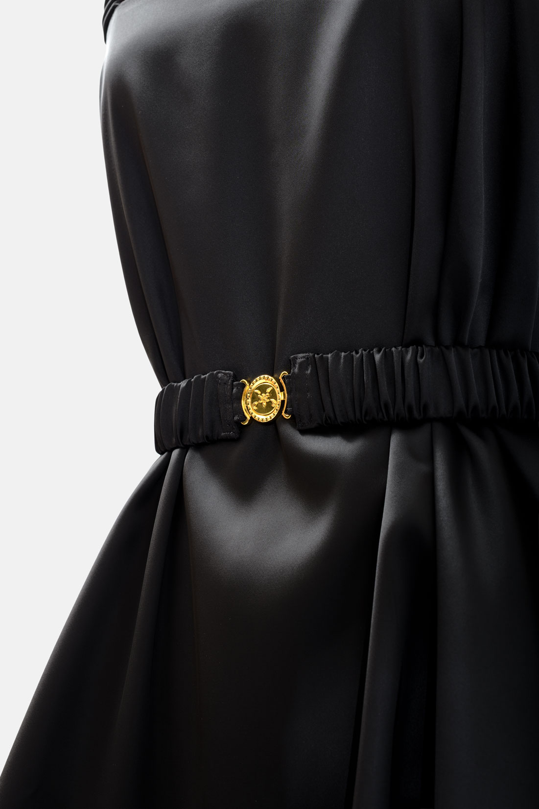 Crafted from premium silky-soft satin, the fabric drapes naturally over the body, while the optional gold-embellished belt tie defines the waist—giving the black satin mini dress a refined, sculpted shape.