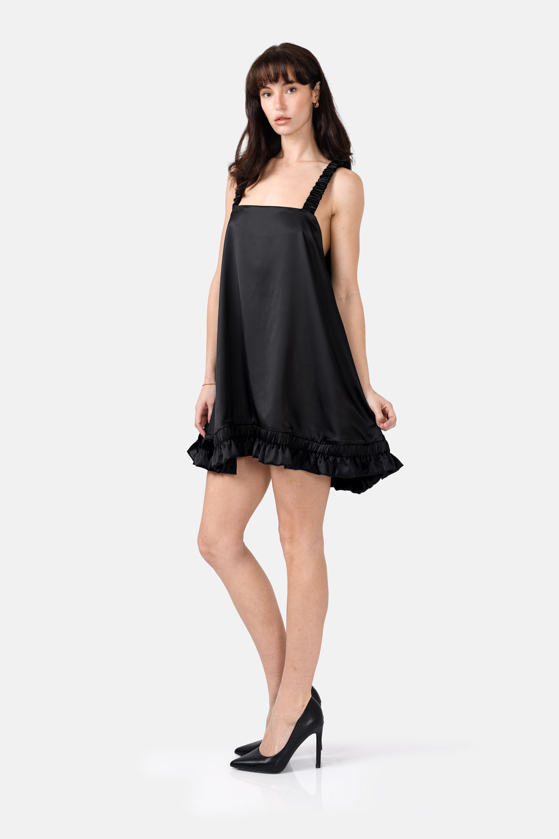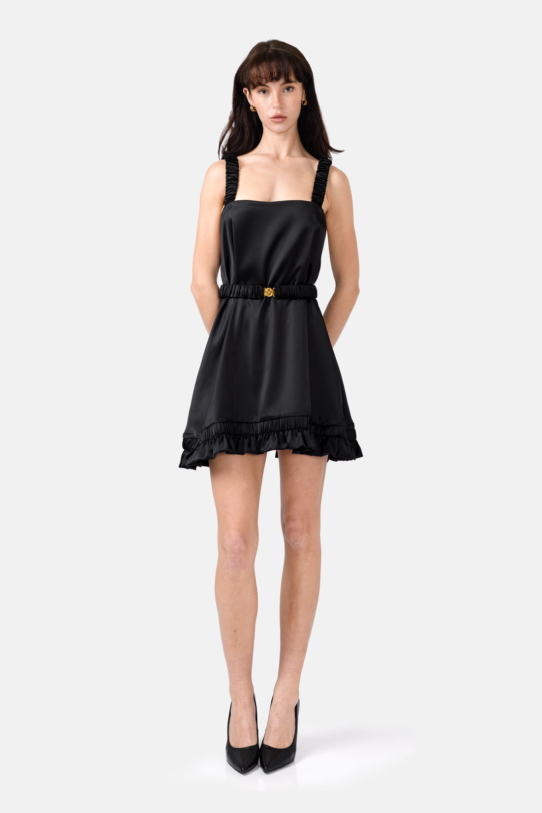 The ruffled straps and hem add soft movement and texture, while the deep black satin and signature gold detailing at the waist create a polished, elevated finish.