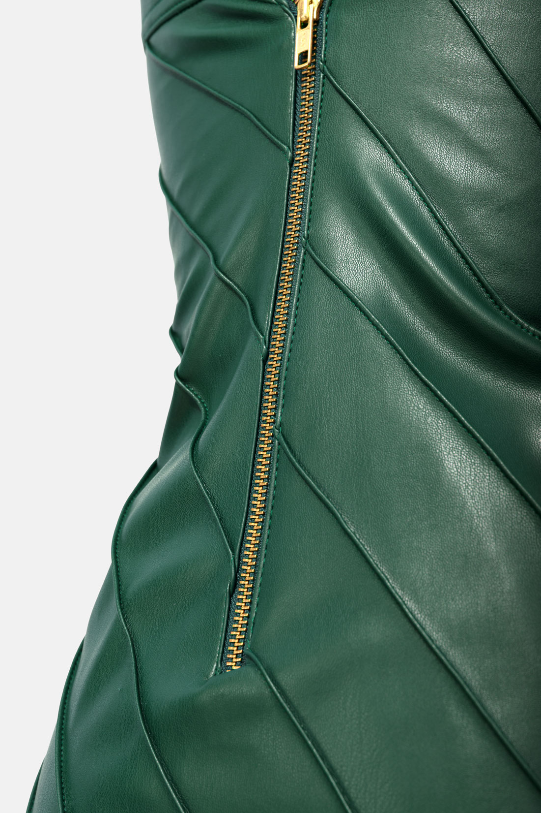 This Green Vegan Leather Pencil Dress emphasises a sharp, sculpted line with diagonal hand-pleating, a sleeveless cut and a midi length. A golden back zip, full premium cupro lining and a small hem slit keep it comfortable and easy to move in. Cut to skim rather than cling, it reads polished and tailored. Step in and zip at the back. The pleating introduces texture and directional structure, shaping a feminine profile while visually lengthening the frame.