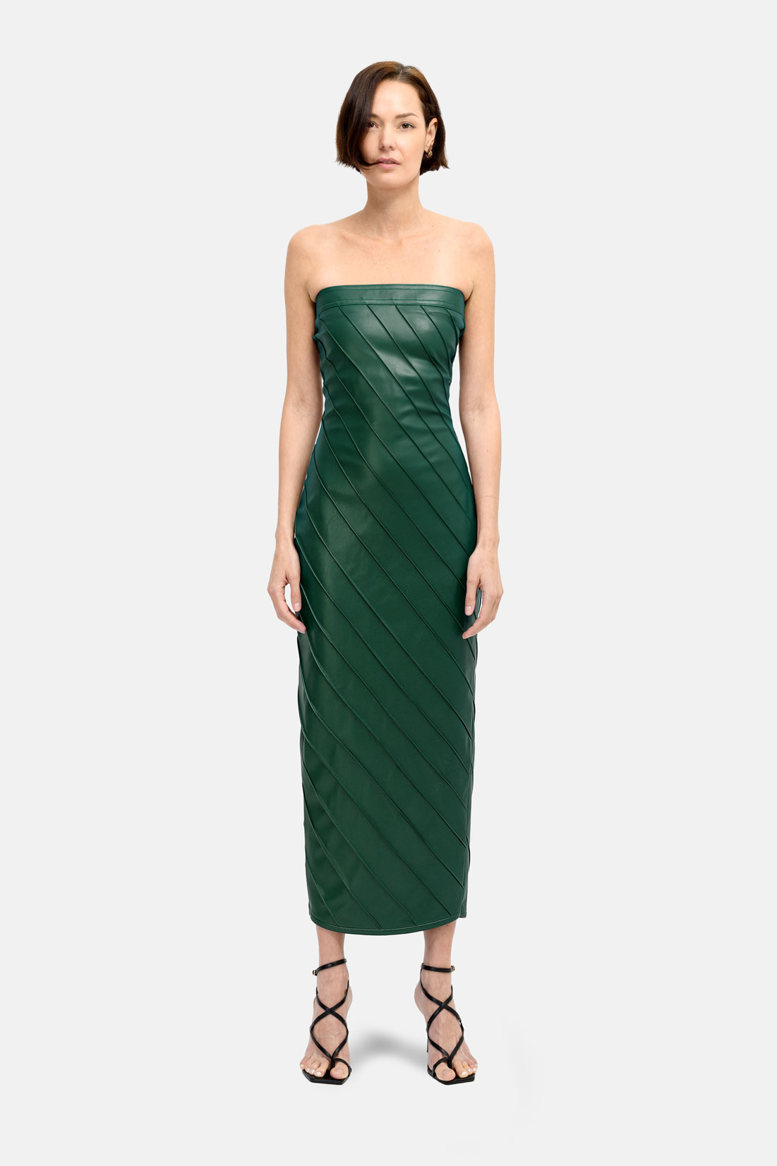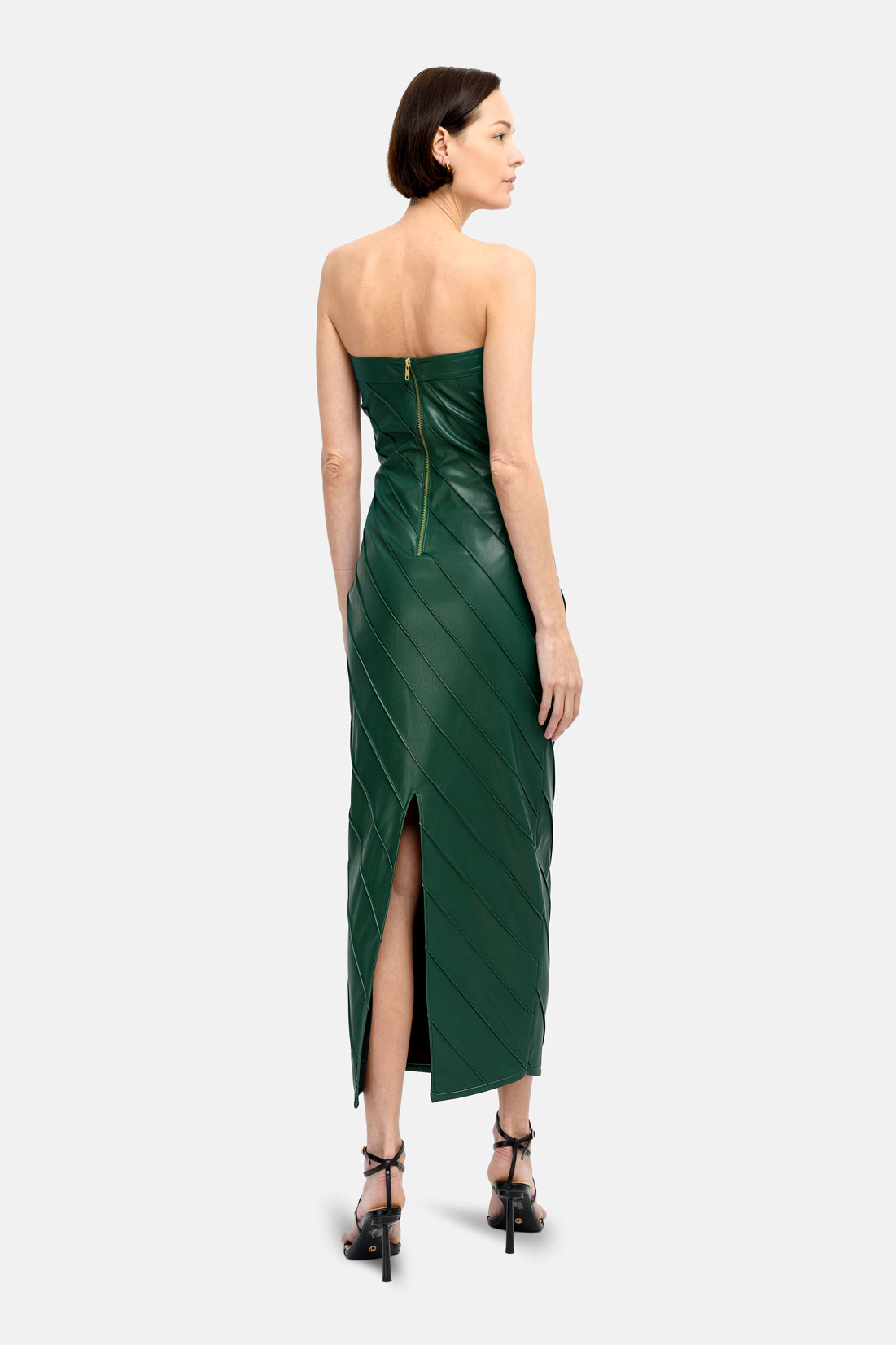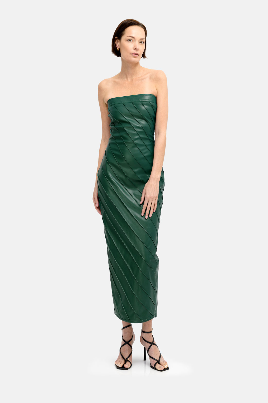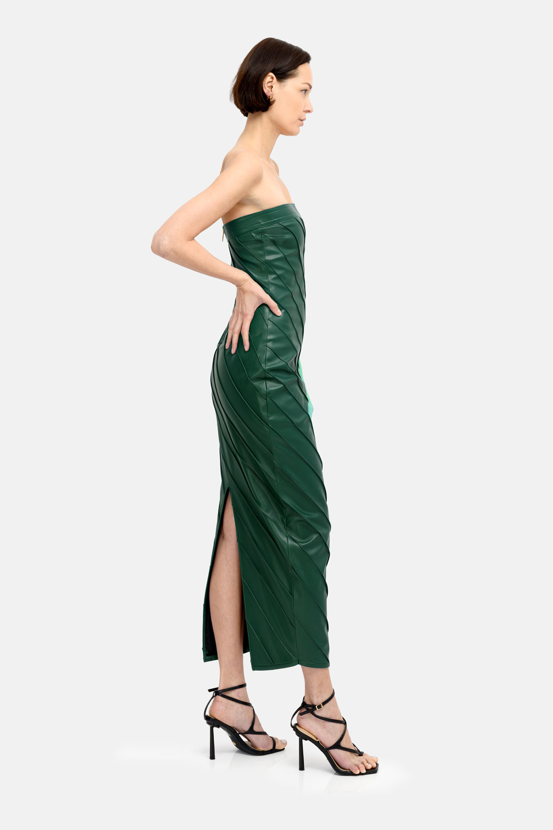 Designer Green Leather Midi Pencil Dress, Strapless With Pleated Finish