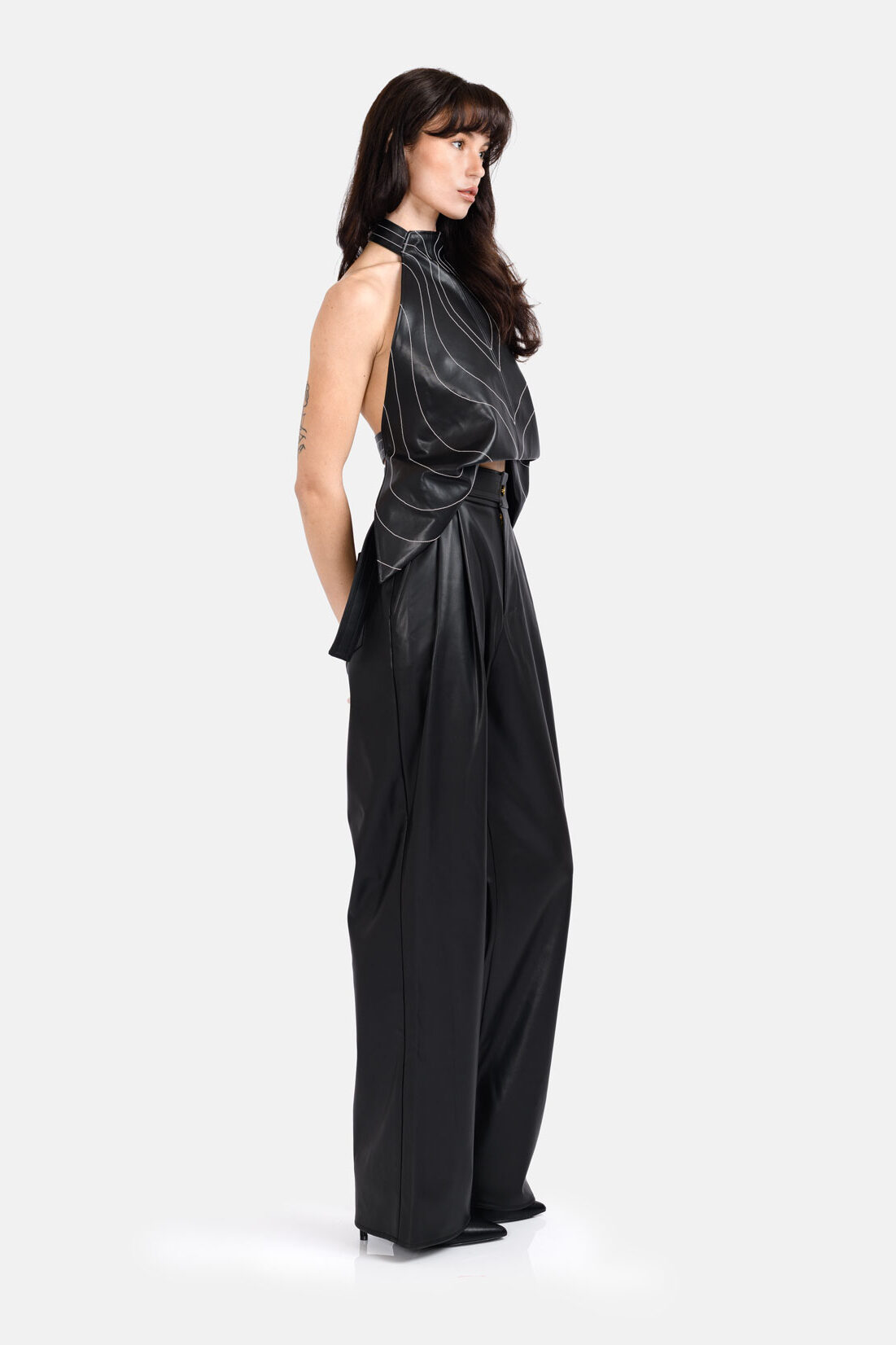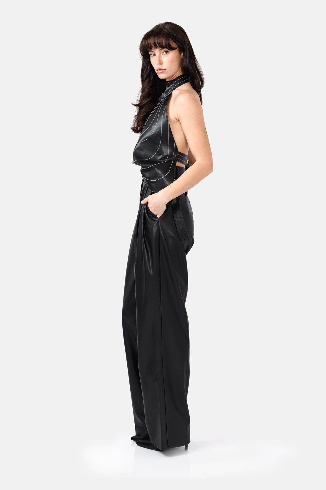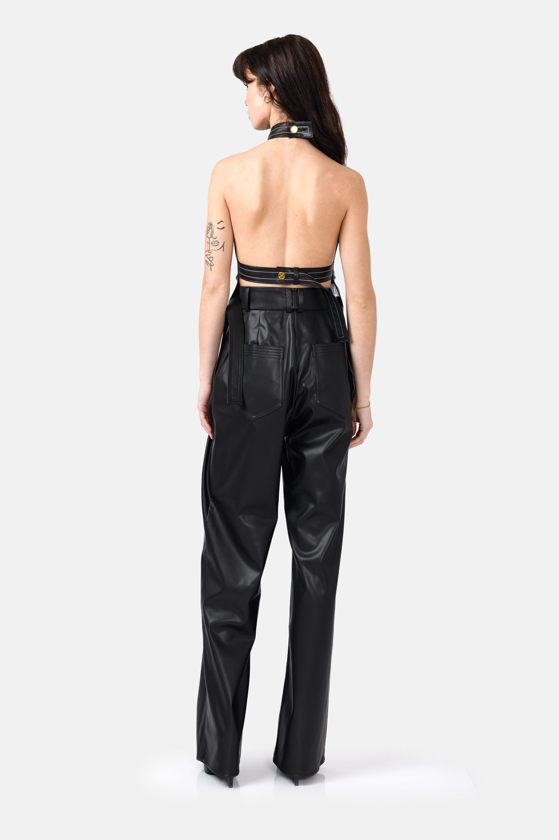 Black leather pants with a straight leg cut and tailored silhouette, designed for a polished yet comfortable fit. Featuring subtle front pleating, gold button details, and a loose belt tie, these designer pants elevate any look with ease. Crafted from mid-weight vegan leather, they offer breathable structure for interseason wear across warm and cool climates. Durable and refined, these faux leather trousers are ethically made in Australia, blending designer-level finish with sustainable craftsmanship.