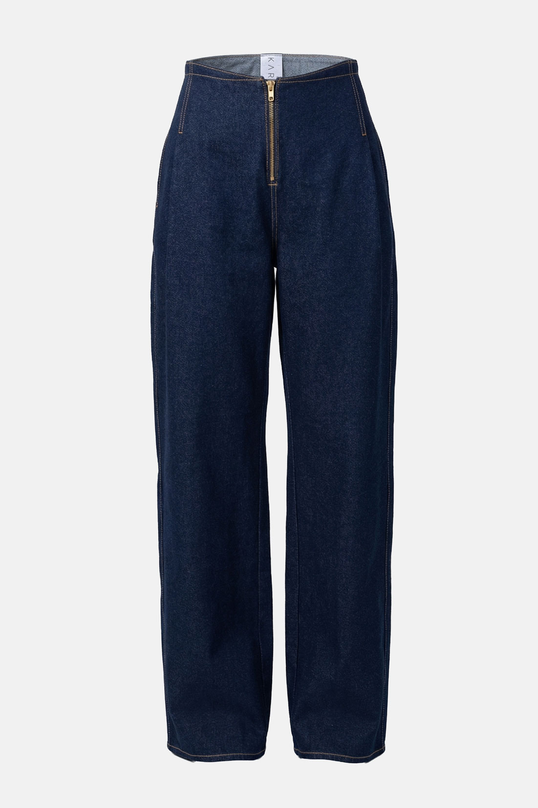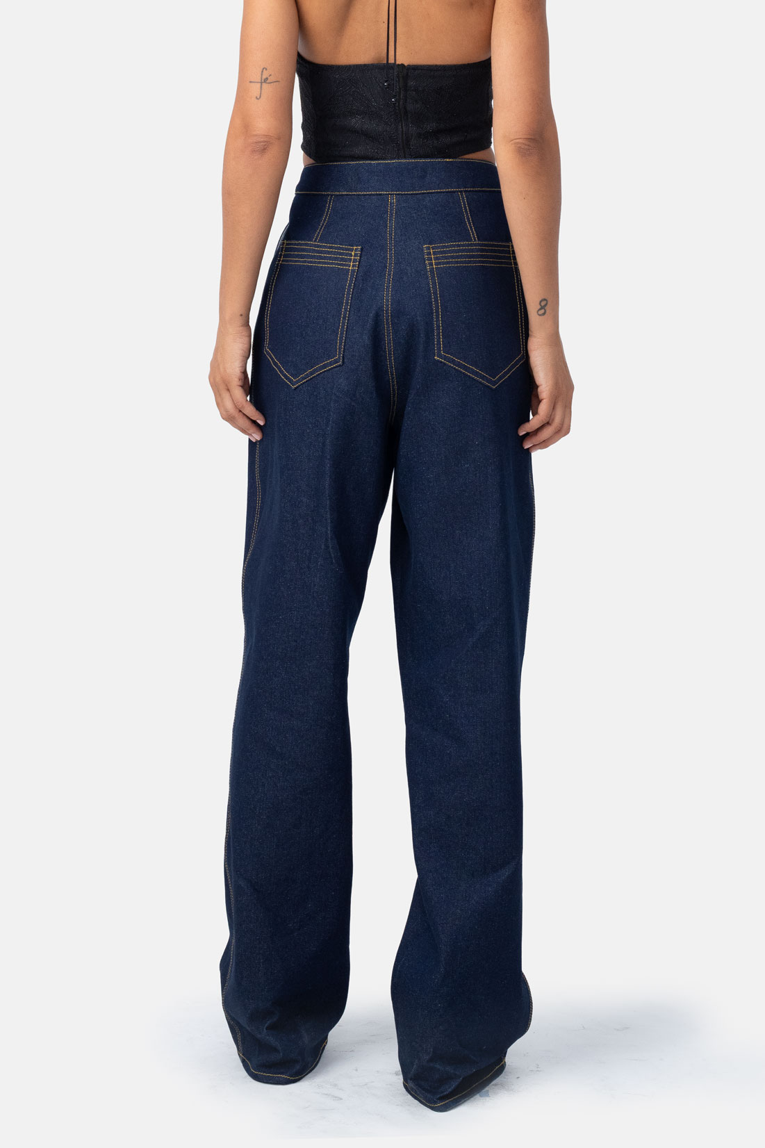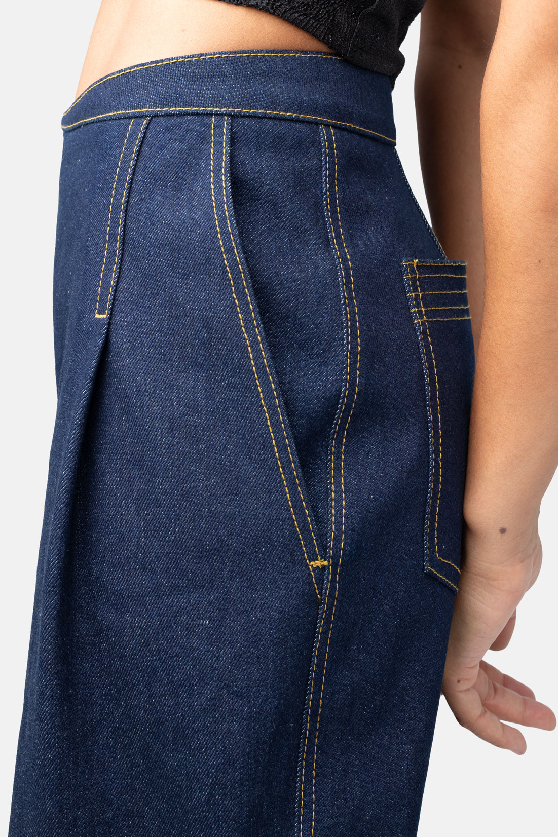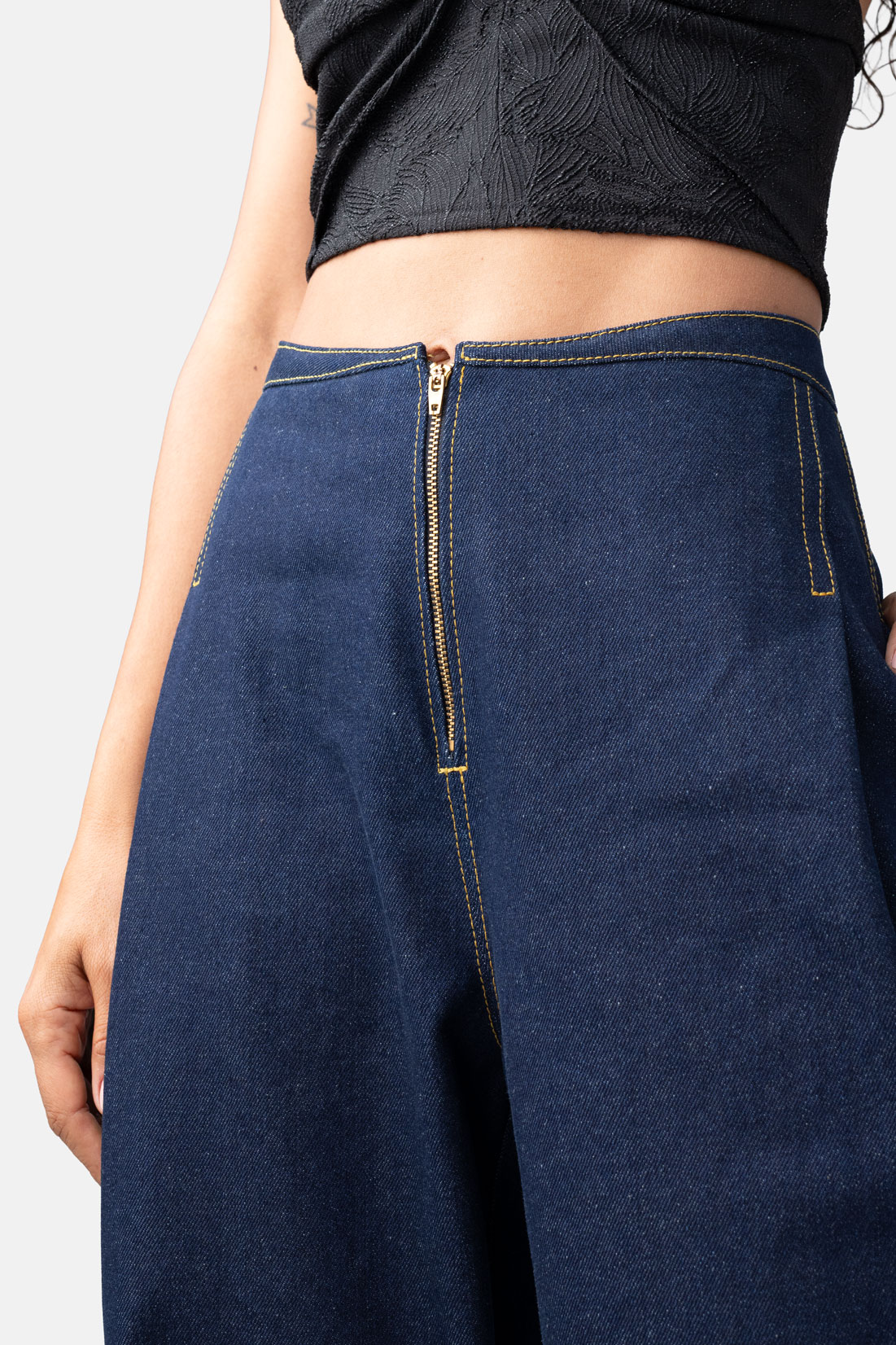 Tailored from premium 100% cotton indigo denim, these wide-leg pants feature an architectural, stylized waistline that redefines the classic utility aesthetic. Meticulous contrasting top-stitch details trace the garment’s structural seams, highlighting a clean, elongated silhouette that transitions effortlessly from day to evening. Designed with a high-rise fit and refined hardware, these trousers offer a sophisticated balance of tactile durability and modern, minimalist design. Elevate the look by pairing them with our matching denim crop or juxtapose the structural weight with a diaphanous silk blouse.