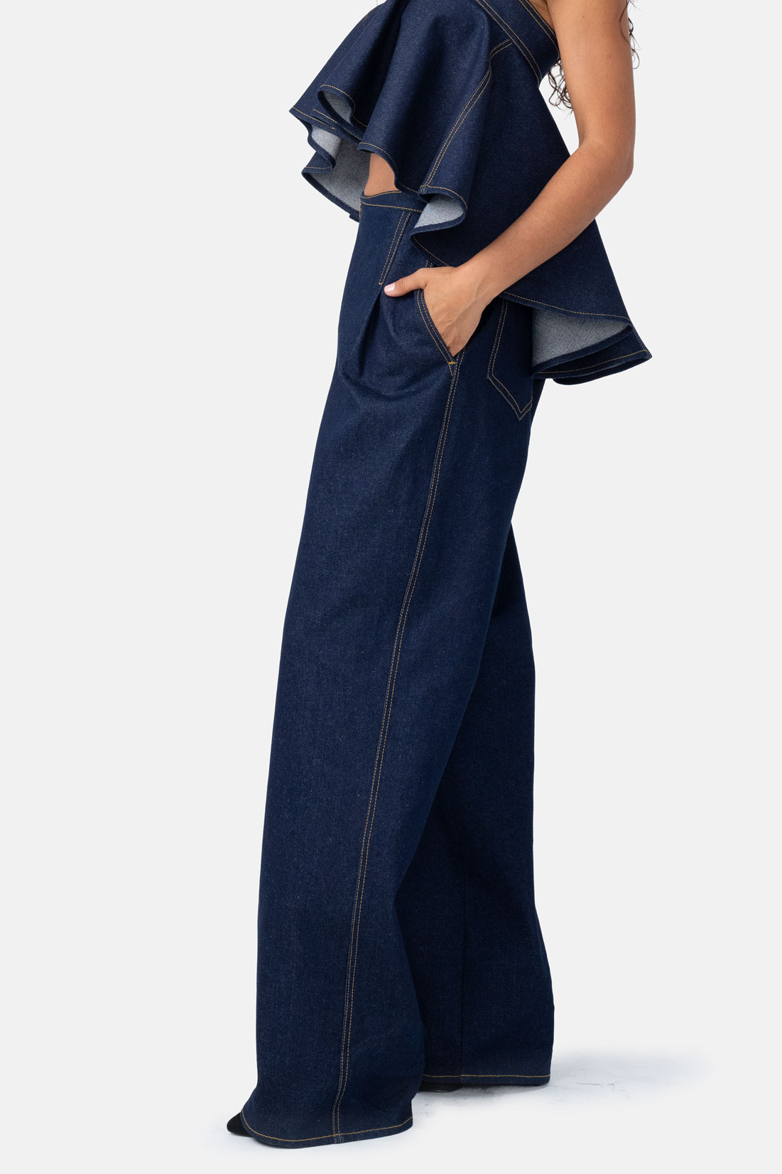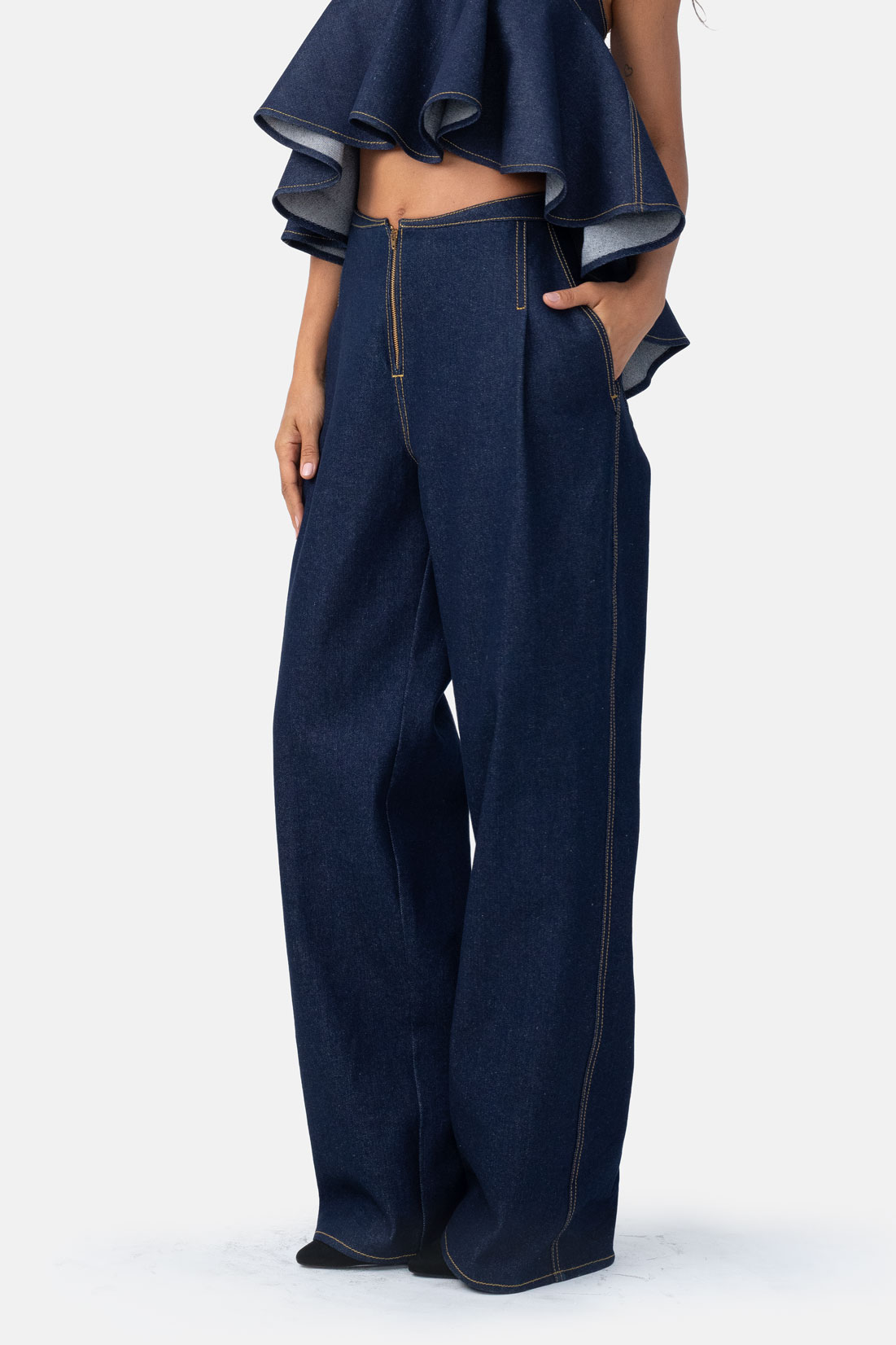 Indigo Denim Wide Leg Pant – High-Waisted Contrast Stitch Trouser with Stylized Waist
