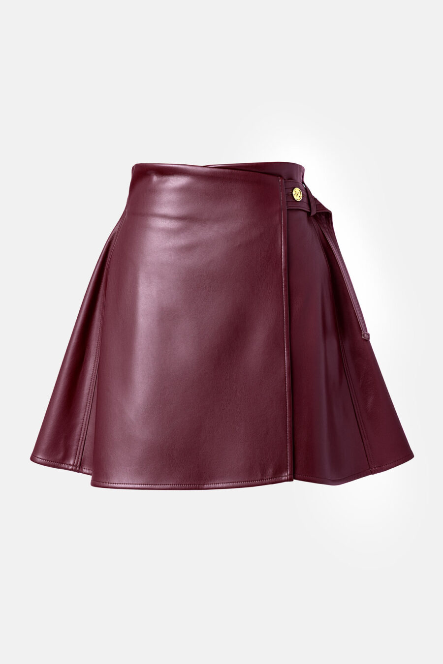 It’s a semi-structured A-line that skims the hips and opens for stride. The cupro lining reduces cling and helps the burgundy vegan leather move cleanly when sitting, walking or dancing – keeping the wrap secure and the hem fluid.
