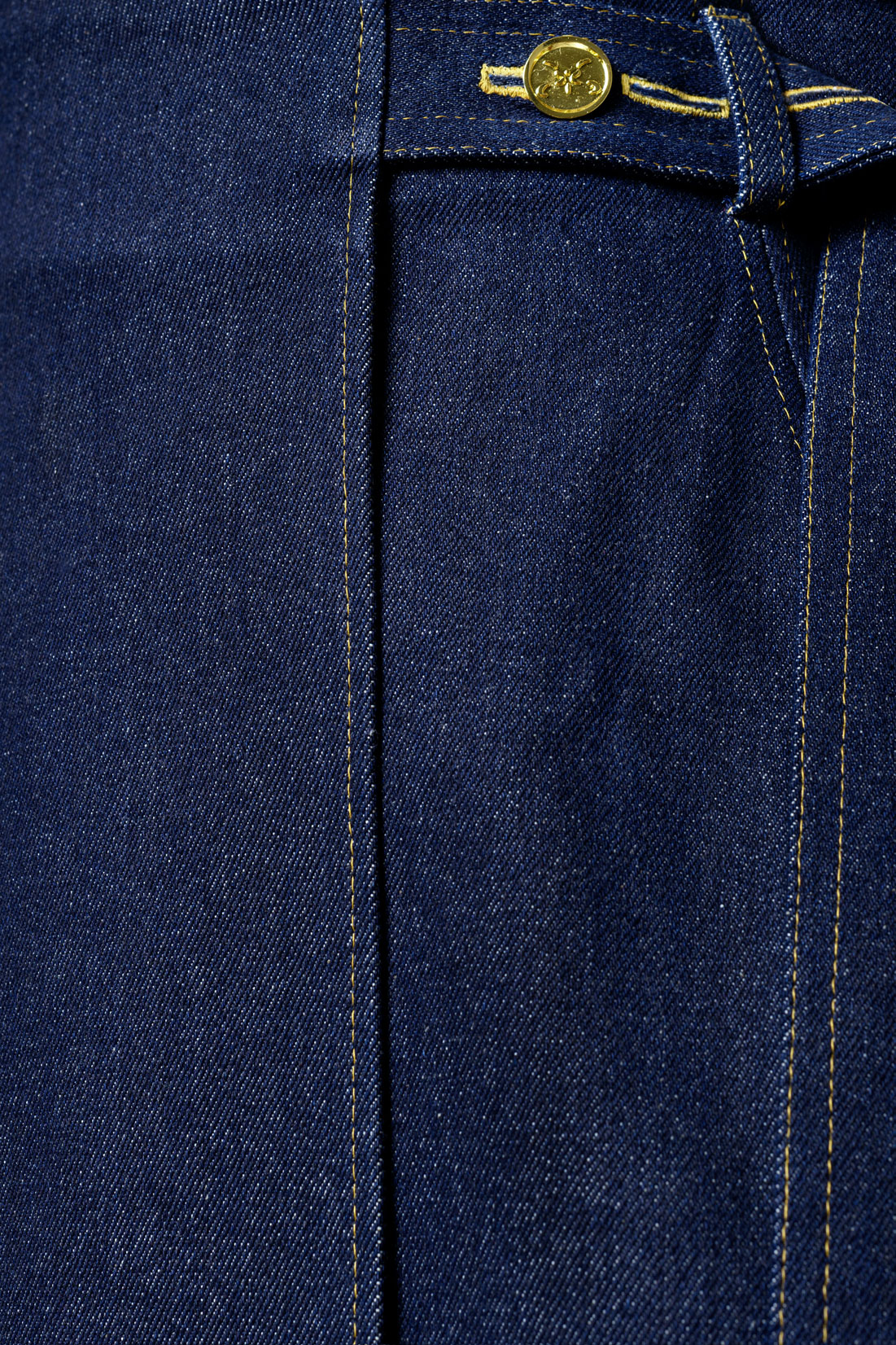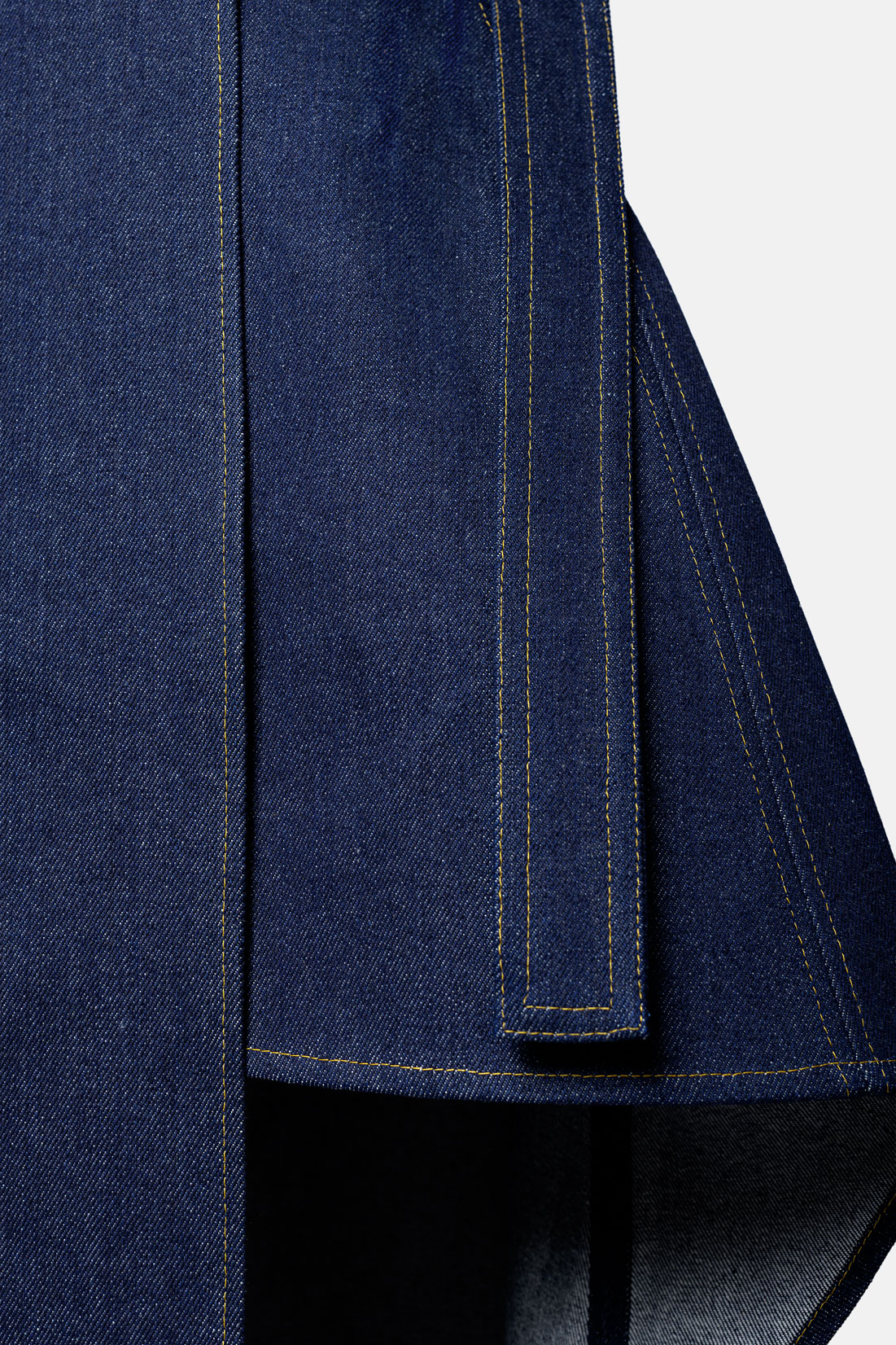 Architectural designer denim skirt in deep-indigo. A high waist and asymmetric drape carve a long, clean line. Mid-weight denim holds the structure while the drape and angle adds sharp movement. Simply wrap around the waist and button up. Three size closures afford flexibility and comfort. Finished with gold hardware and precise topstitching. Pair with a simple crop or vest for elevated on-the-go styling. This piece is designed as an everyday go-to, a true wardrobe companion.