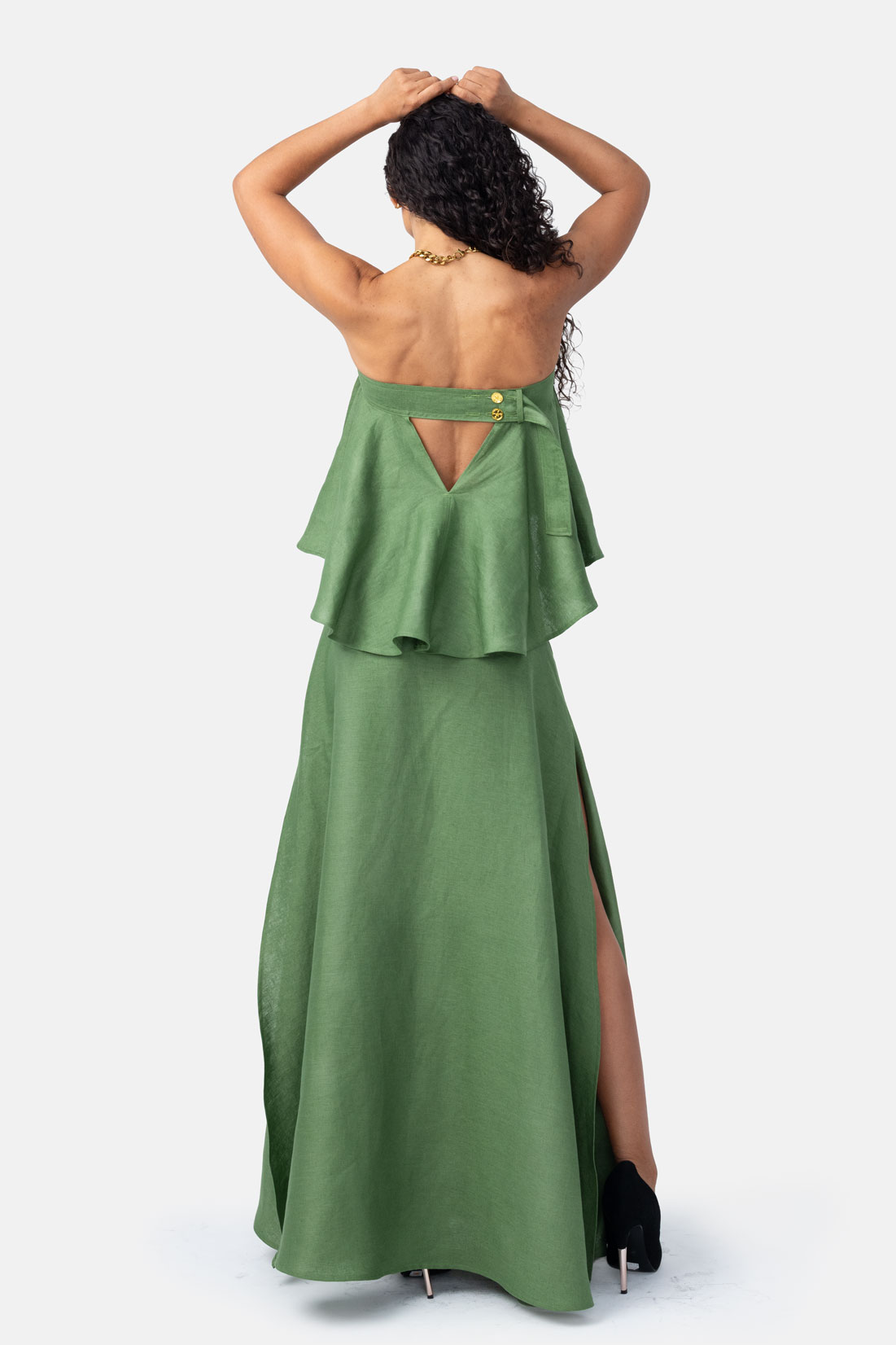 Yes—the strapless silhouette is supported by an internal bust tie with three adjustable settings. This allows the black linen maxi dress to contour securely to your upper body while maintaining its relaxed, flowing shape through the skirt.