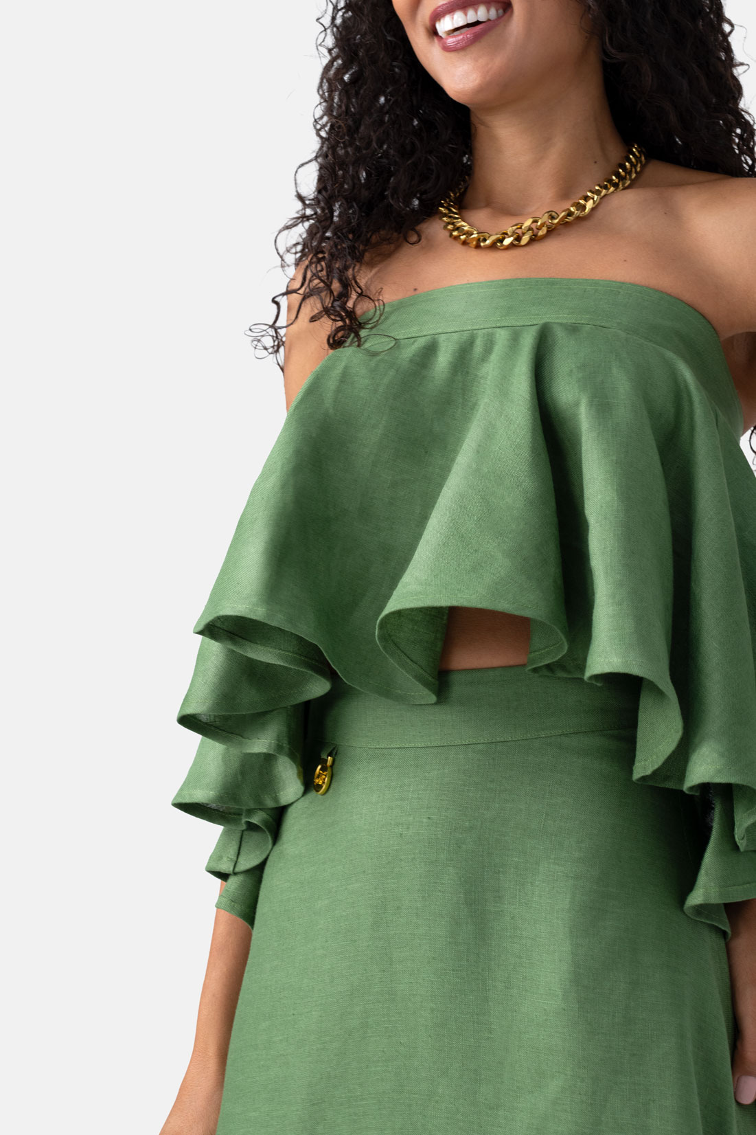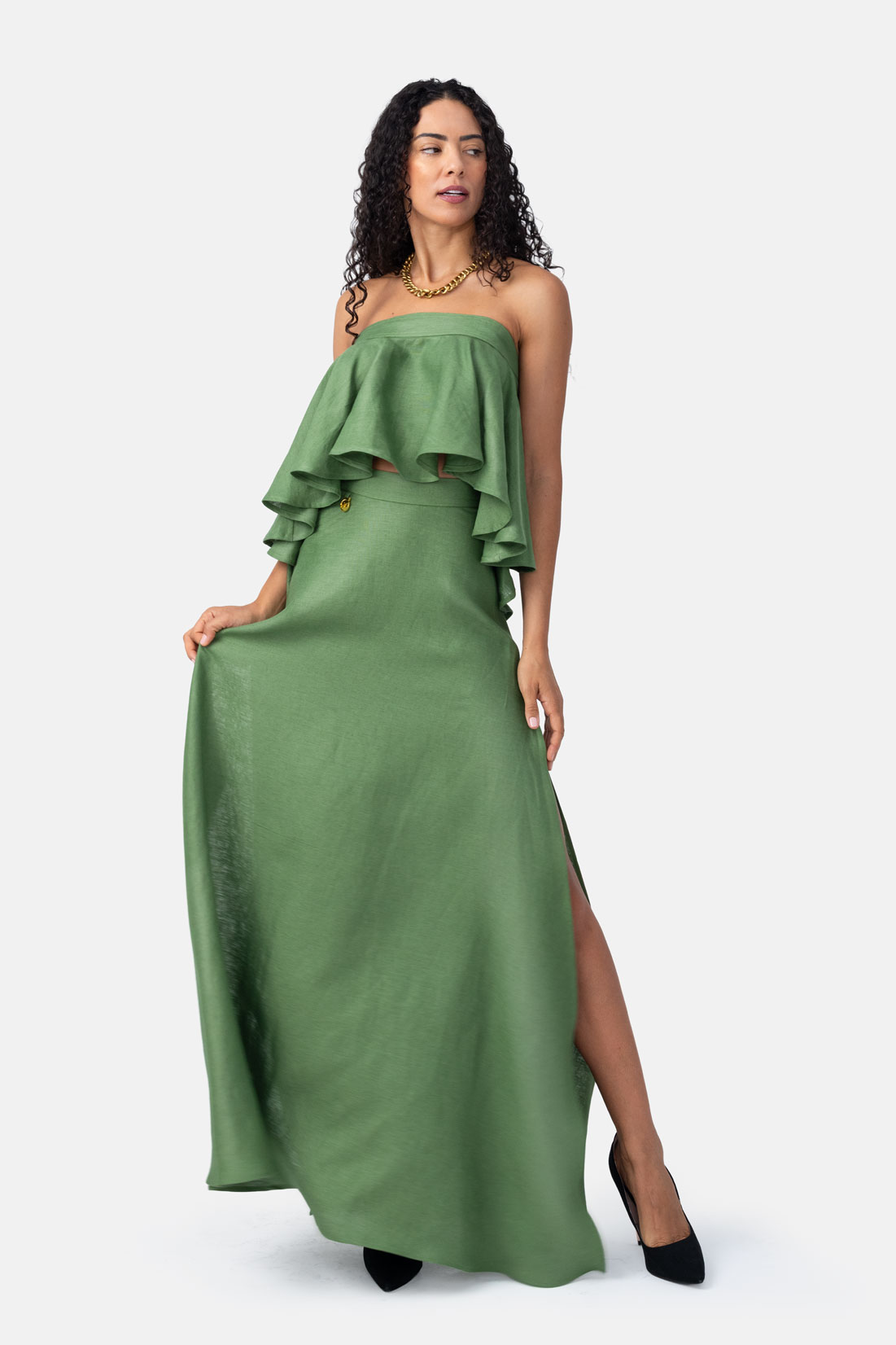 Elevate your warm-weather wardrobe with this stunning high-waisted olive green maxi skirt. Crafted from breathable 100% linen, it offers a flattering, flowing silhouette that keeps you comfortable all day long. The elegant design features stylish side slits for ease of movement and a discreet side zip closure for a perfectly seamless fit. Pair this versatile linen skirt with our matching top for an effortlessly chic and sophisticated look.