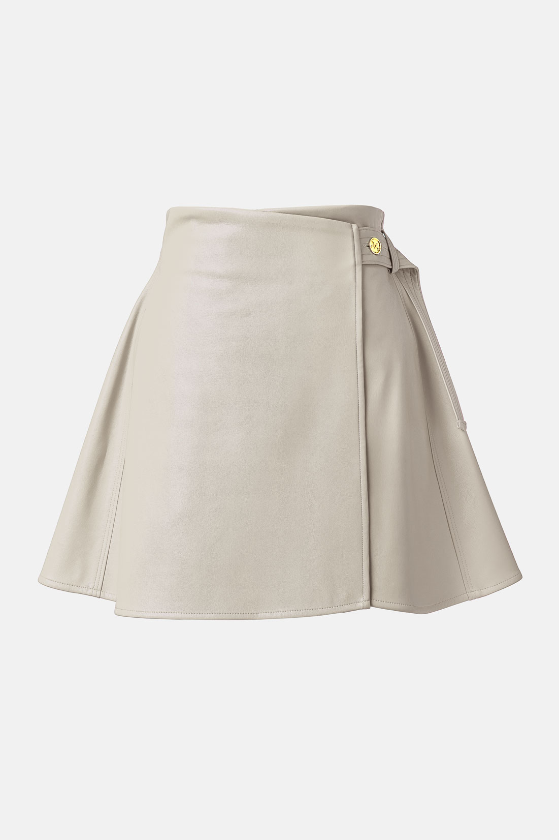 Eggshell vegan-leather wrap mini skirt with a refined, softly flared A-line. Cut to sit high on the waist, it secures with a neat tab offering three button settings for a precise, adjustable fit. Fully lined in premium cupro so it glides over the hips and keeps a smooth profile. A slender side belt drapes cleanly at the hip, adding quiet detail to the minimalist cut. The light eggshell tone sharpens the silhouette and lifts knitwear and tailoring – pair with the matching Whisper vest, crisp shirting or a fine rib knit for polished day-to-evening styling. Australian made, cruelty-free and responsibly produced.