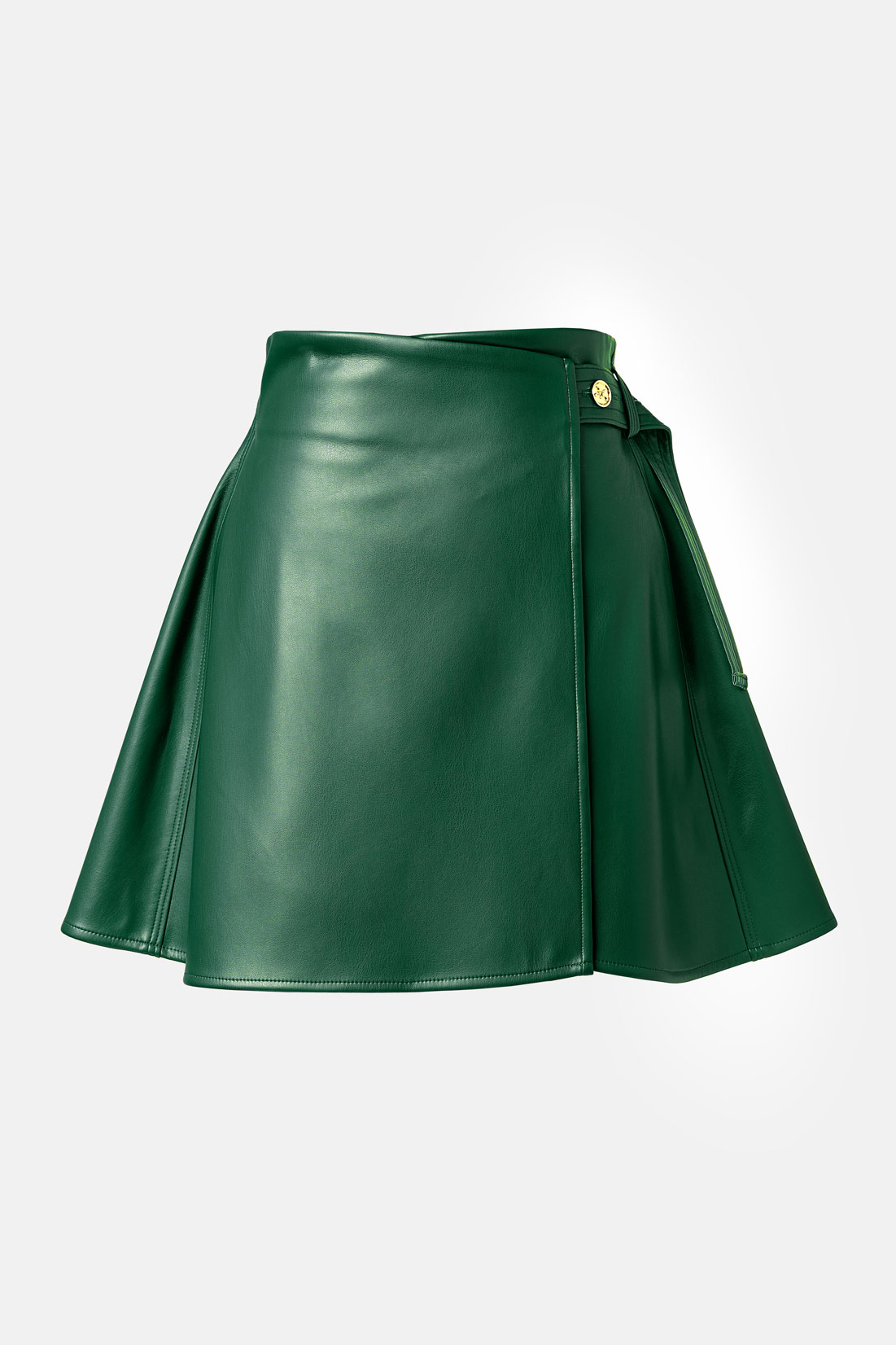 A clean, A-line mini that sits at the natural/high waist. The wrap secures with a tab featuring three button positions for a precise, close fit. The cupro lining keeps the silhouette smooth and comfortable through the hips for all-day wear. There are three size settings to ensure a comfortable fit.