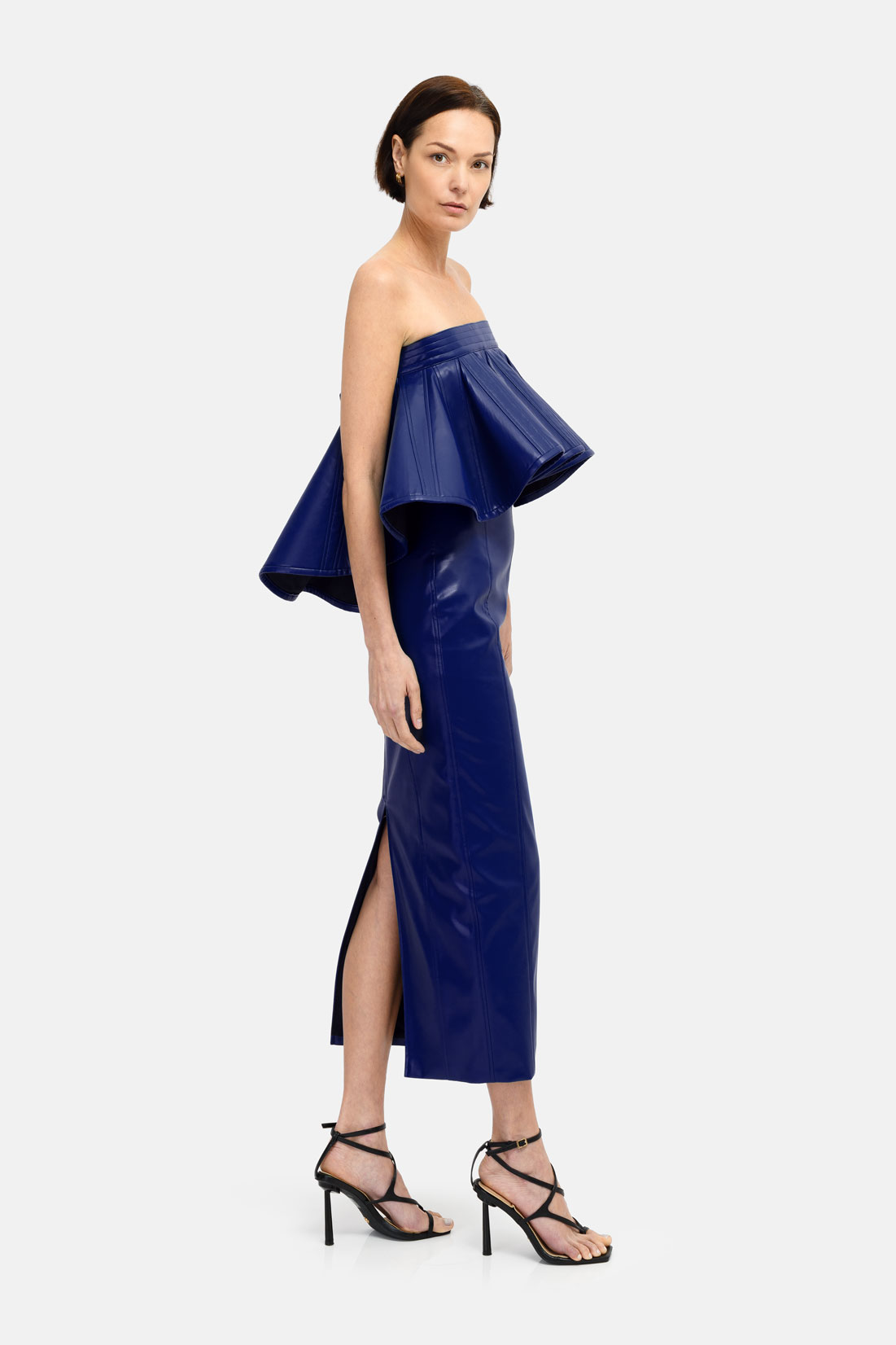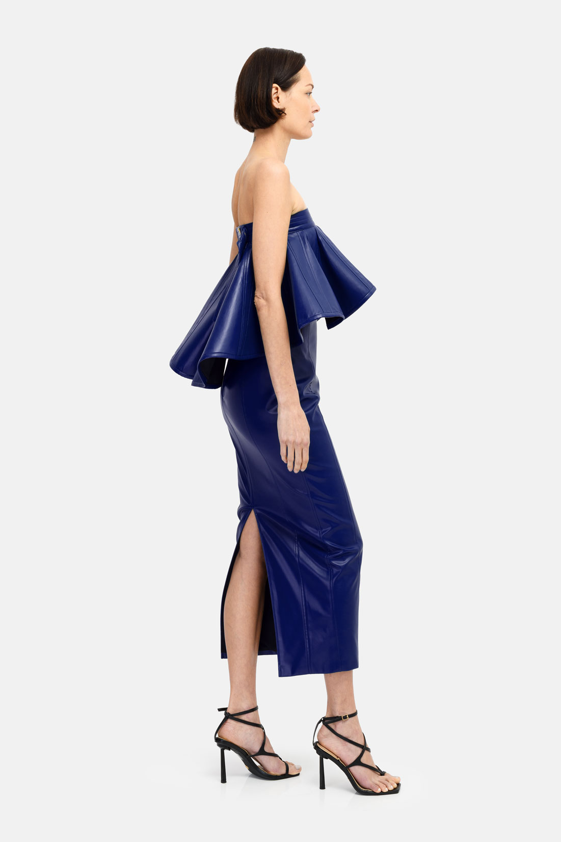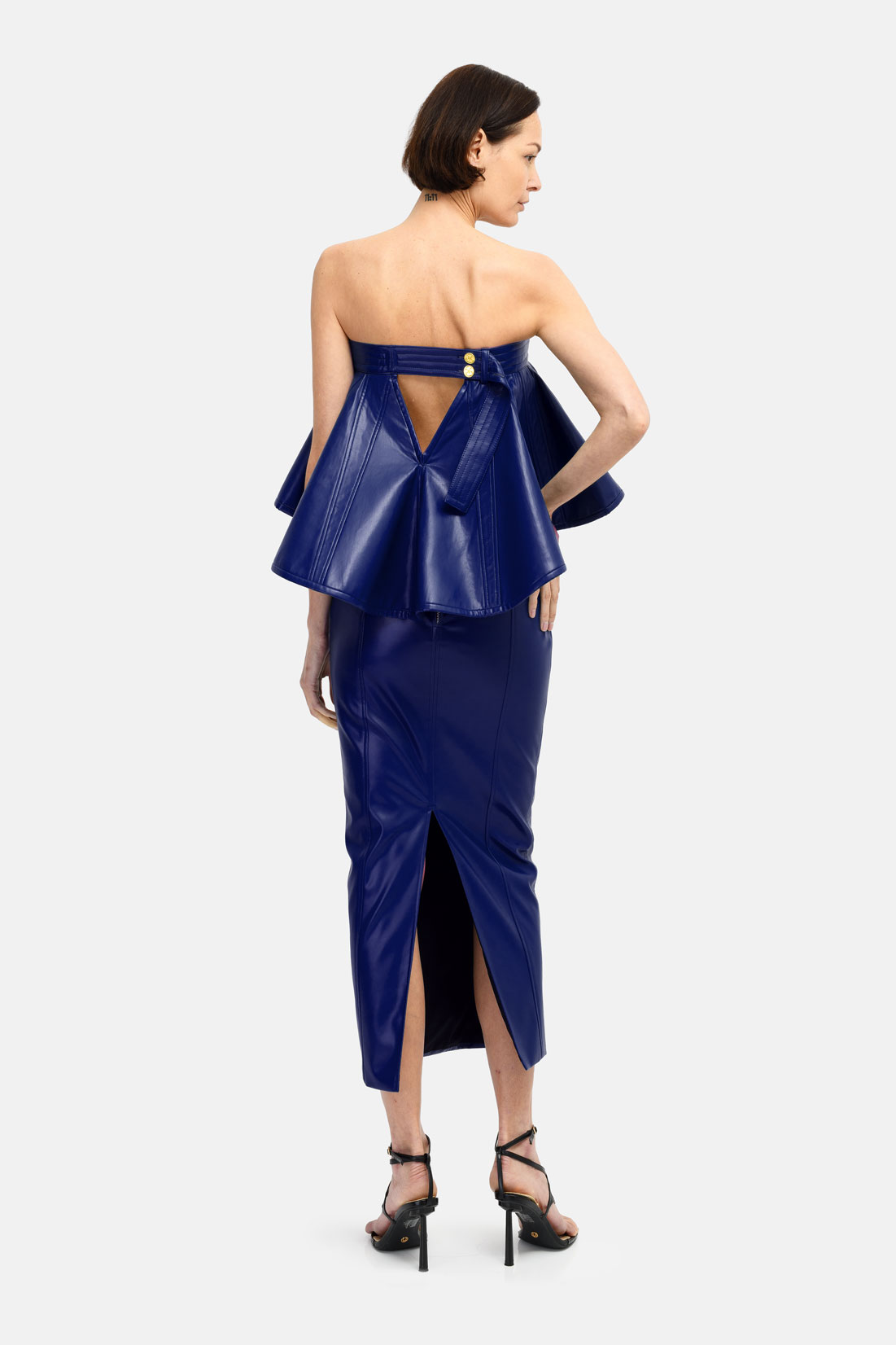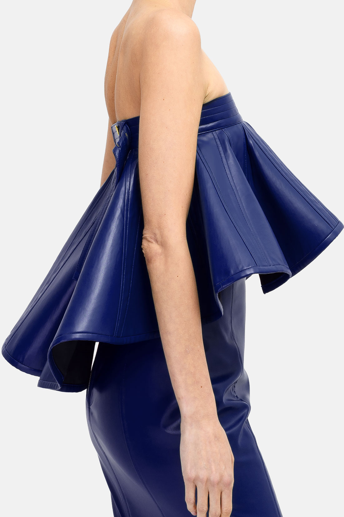 This designer leather crop top in deep navy channels a sleek, artful profile with polished restraint. Asymmetric lines refine the neckline and gently contour the waist, creating elongation and balanced proportion. Softly flared pleating lends fluid movement and a quiet sense of poise. Made from mid-weight vegan leather and fully lined in premium cupro, it feels supportive yet breathable. An adjustable button closure provides three fit positions, securing cleanly at the high bust while easing through the lower bust and ribcage. Style it with tailored trousers or a pencil skirt for an elegant, day-to-evening silhouette that wears effortlessly.