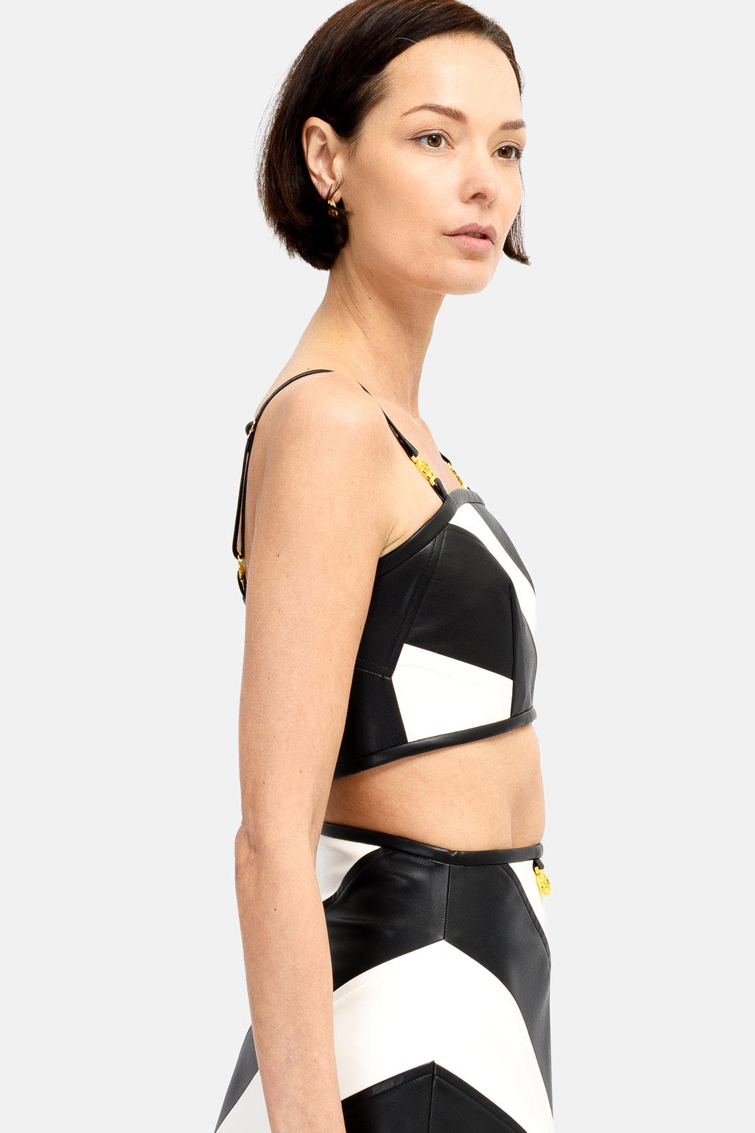Designer Leather Crop Top in black and white stripes. Diagonal panel work in premium vegan leather, fully lined in luxurious cupro. Structured and close through the bust, soft against the skin. Back zip for a clean close; adjustable straps to fine-tune the fit. Polished gold accents lift the graphic lines and frame the upper body. Wear with the matching Temper Skirt for a statement set, or let the top shine and pair with a simple monochrome skirt or trouser and subtle heel. Made in Australia, in-house.