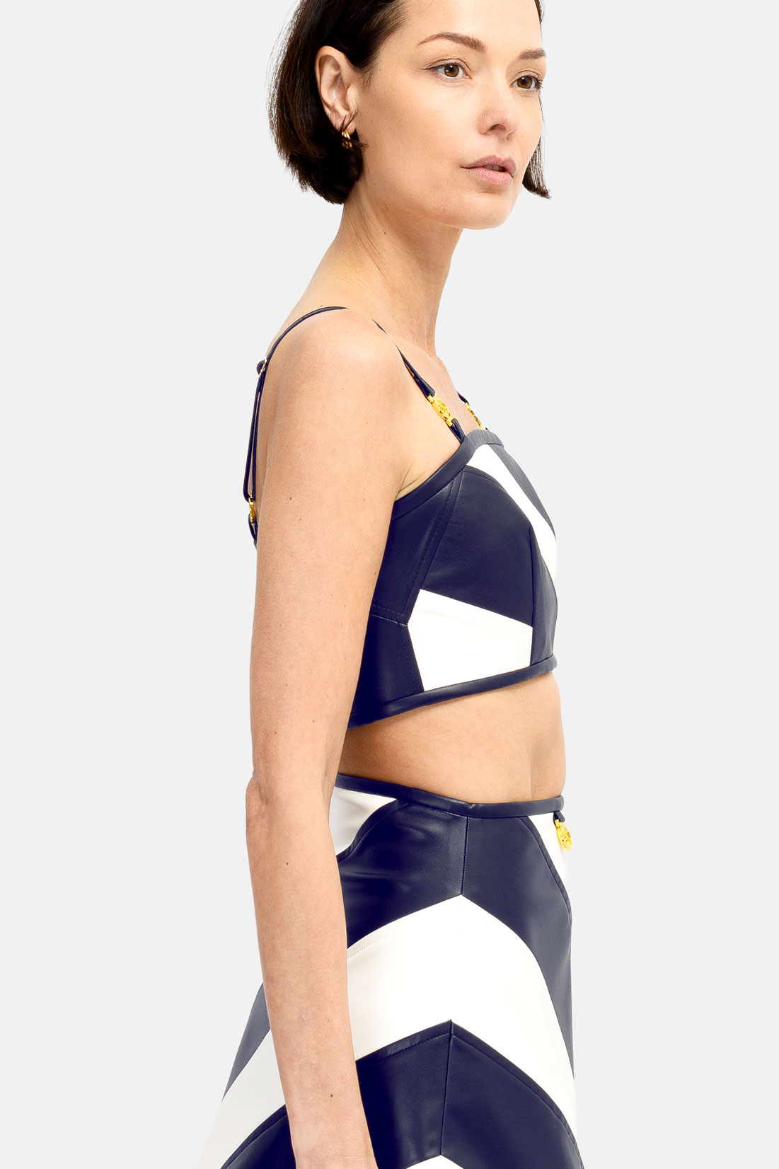 Designer Leather Crop Top in sleek navy and white. Diagonal stripe panels in premium vegan leather create a sharp, framing effect, balanced by a clean straight neckline and slim, adjustable straps. Fully lined in luxurious cupro, the top feels soft against the skin while holding a refined, structured fit through the bust. A discreet back zip closes smoothly so the front reads crisp and uninterrupted. Subtle gold hardware lifts the palette without distracting from the lines. Style it with the matching Temper Skirt for a set, or pair with tailored navy trousers, white denim, or a sleek pencil skirt for city-evening polish. Made in Australia – in-house, in limited runs.
