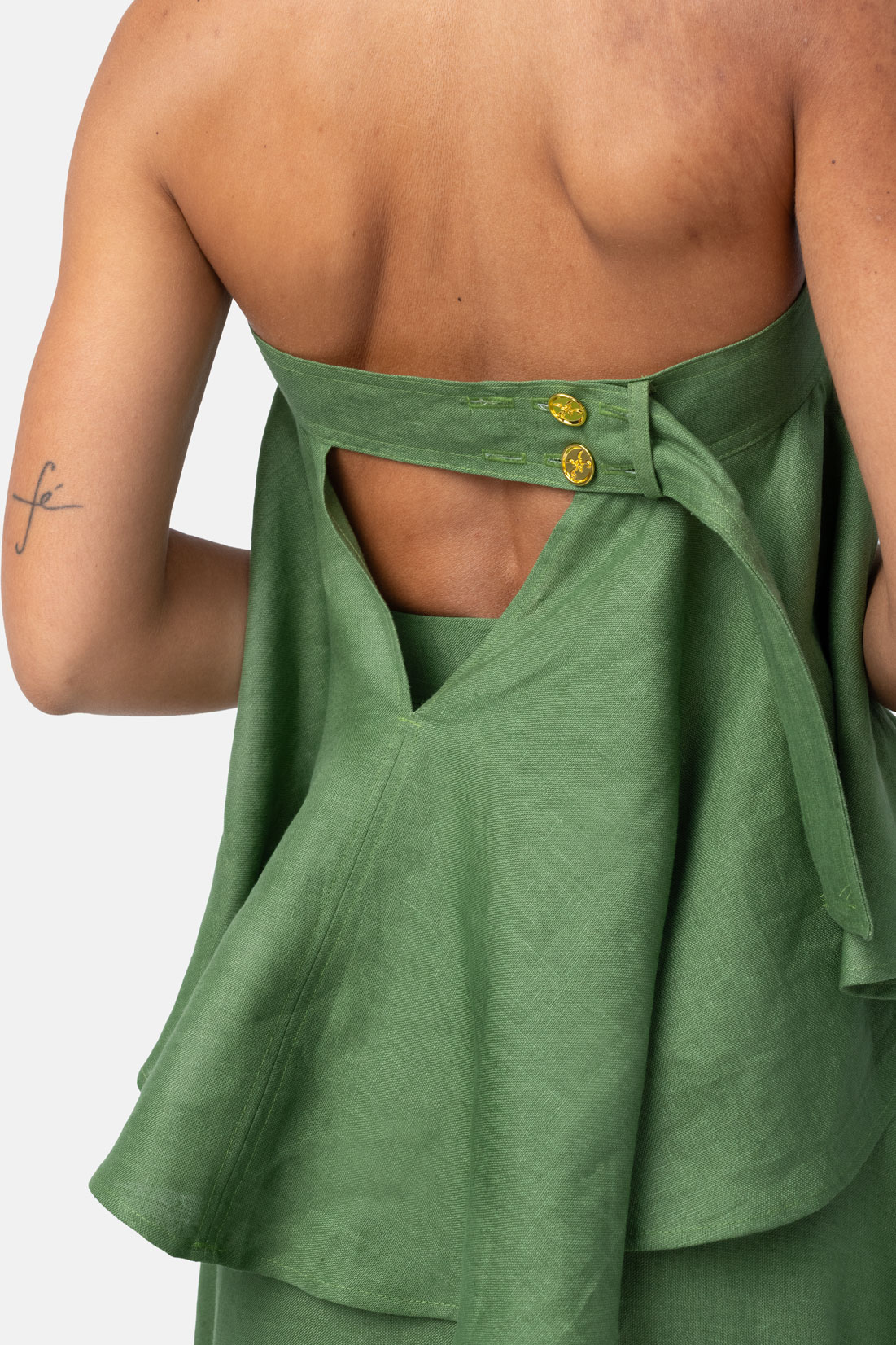 Elevate your warm-weather wardrobe with this stunning olive green strapless crop top, featuring an elegant, flowing pleated design. Crafted in 100% premium breathable linen, it offers luxurious comfort alongside a beautifully structured silhouette. The versatile back button closure includes three adjustable options, providing a flexible, customized fit tailored to your shape. Pair this fashionable piece with its matching maxi skirt or your favourite high-waisted trousers for an effortlessly chic, breezy ensemble.
